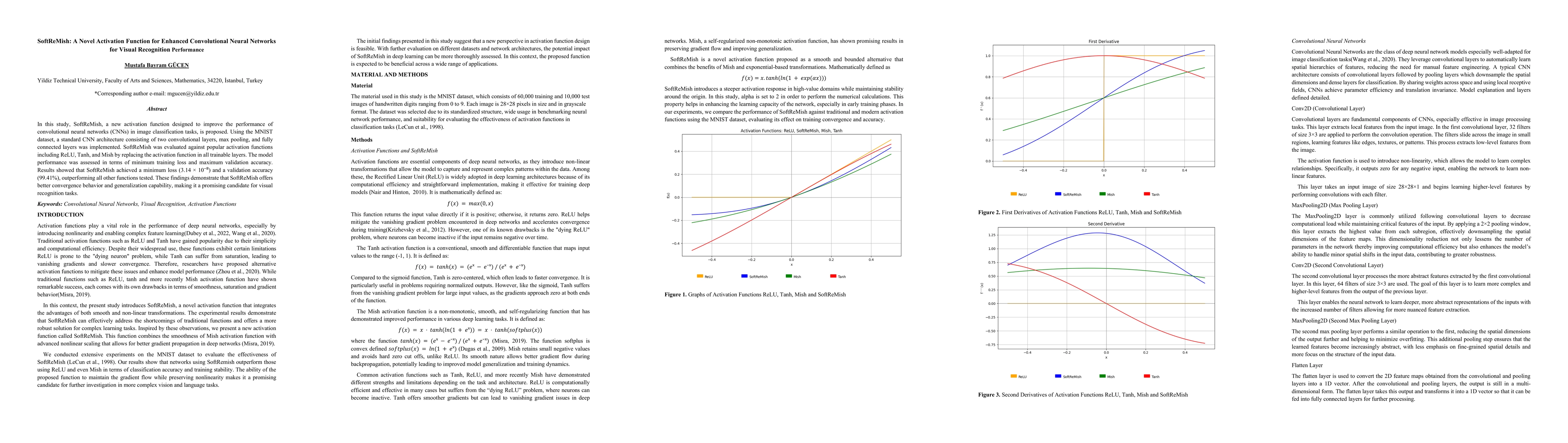 The research introduces SoftReMish, a new activation function enhancing CNN performance in image classification. It outperformed ReLU, Tanh, and Mish on MNIST, achieving a minimum loss of 3.14e-8 and validation accuracy of 99.41%, suggesting its potential for visual recognition tasks.