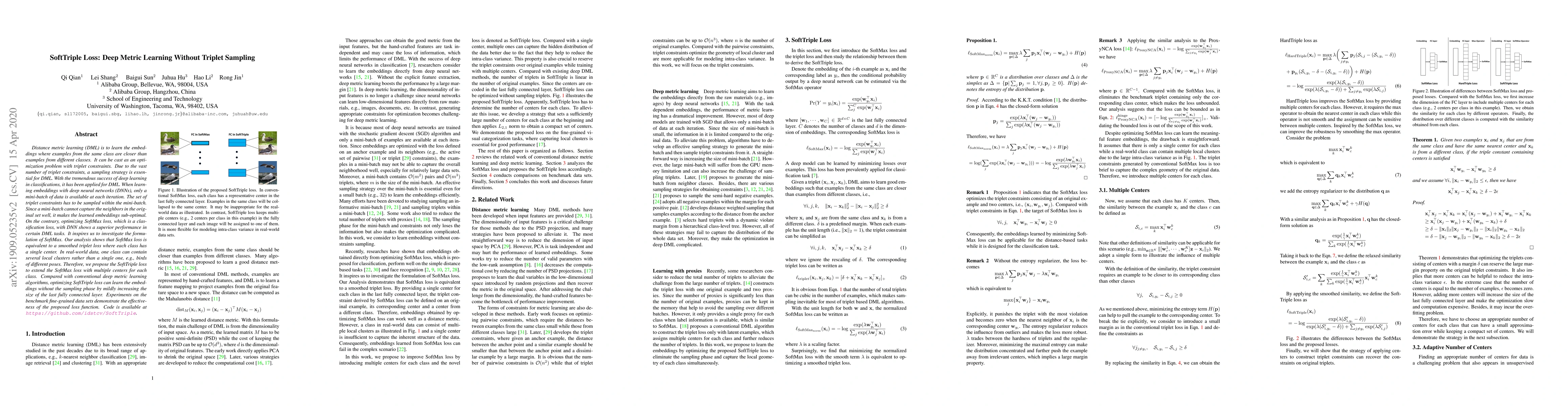 Distance metric learning (DML) is to learn the embeddings where examples from the same class are closer than examples from different classes. It can be cast as an optimization problem with triplet constraints. Due to the vast number of triplet constraints, a sampling strategy is essential for DML. With the tremendous success of deep learning in classifications, it has been applied for DML. When learning embeddings with deep neural networks (DNNs), only a mini-batch of data is available at each iteration. The set of triplet constraints has to be sampled within the mini-batch. Since a mini-batch cannot capture the neighbors in the original set well, it makes the learned embeddings sub-optimal. On the contrary, optimizing SoftMax loss, which is a classification loss, with DNN shows a superior performance in certain DML tasks. It inspires us to investigate the formulation of SoftMax. Our analysis shows that SoftMax loss is equivalent to a smoothed triplet loss where each class has a single center. In real-world data, one class can contain several local clusters rather than a single one, e.g., birds of different poses. Therefore, we propose the SoftTriple loss to extend the SoftMax loss with multiple centers for each class. Compared with conventional deep metric learning algorithms, optimizing SoftTriple loss can learn the embeddings without the sampling phase by mildly increasing the size of the last fully connected layer. Experiments on the benchmark fine-grained data sets demonstrate the effectiveness of the proposed loss function. Code is available at https://github.com/idstcv/SoftTriple