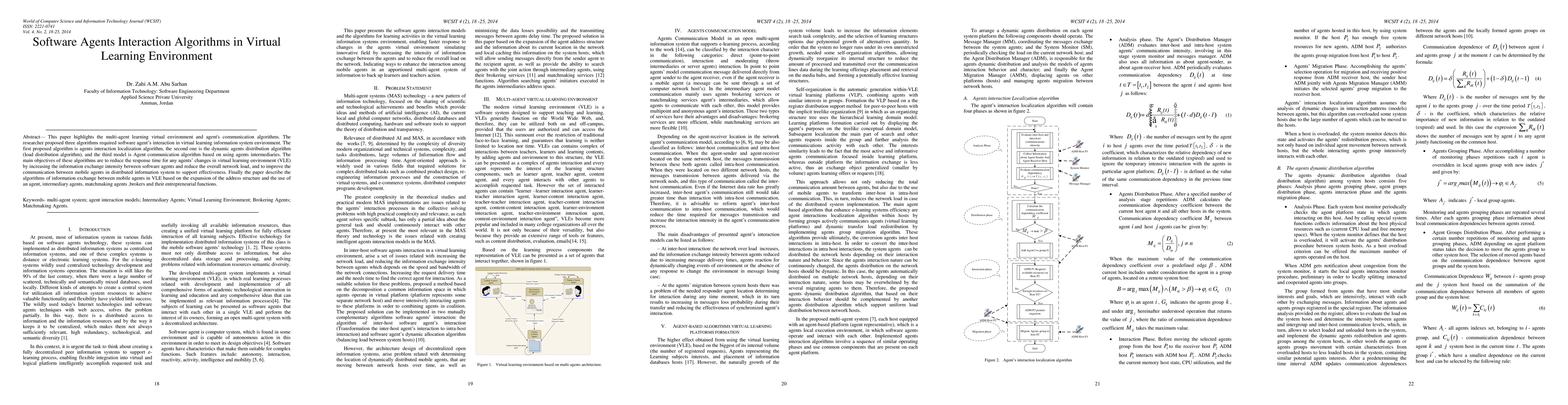 This paper proposes three algorithms for software agents interaction in virtual learning environments: an agents interaction localization algorithm, a dynamic agents distribution algorithm, and an agent communication algorithm using intermediaries. The aim is to reduce response time and network load, and enhance communication efficiency among mobile agents.