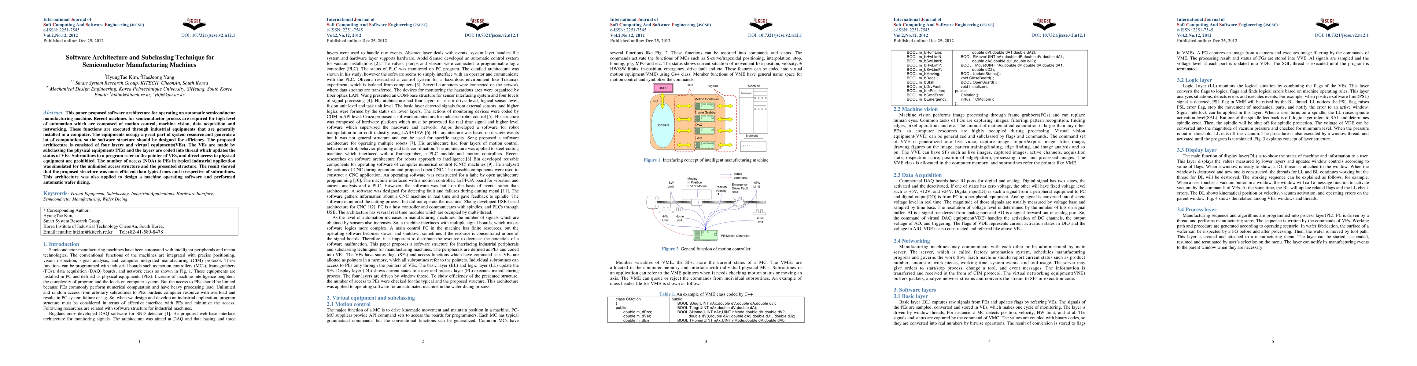 This paper proposed software architecture for operating an automatic semiconductor manufacturing machine. Recent machines for semiconductor process are required for high level of automation which are composed of motion control, machine vision, data acquisition and networking. These functions are executed through industrial equipments that are generally installed in a computer. The equipments occupy a great part of system resource and generate a lot of computation, so the software structure should be designed for efficiency. The proposed architecture is consisted of four layers and virtual equipments(VEs). The VEs are made by subclassing the physical equipments(PEs) and the layers are coded into thread which updates the status of VEs. Subroutines in a program refer to the pointer of VEs, and direct access to physical equipment are prohibited. The number of access (NOA) to PEs in typical industrial application was simulated for the unlimited access structure and the presented structure. The result showed that the proposed structure was more efficient than typical ones and irrespective of subroutines. This architecture was also applied to design a machine operating software and performed automatic wafer dicing.
