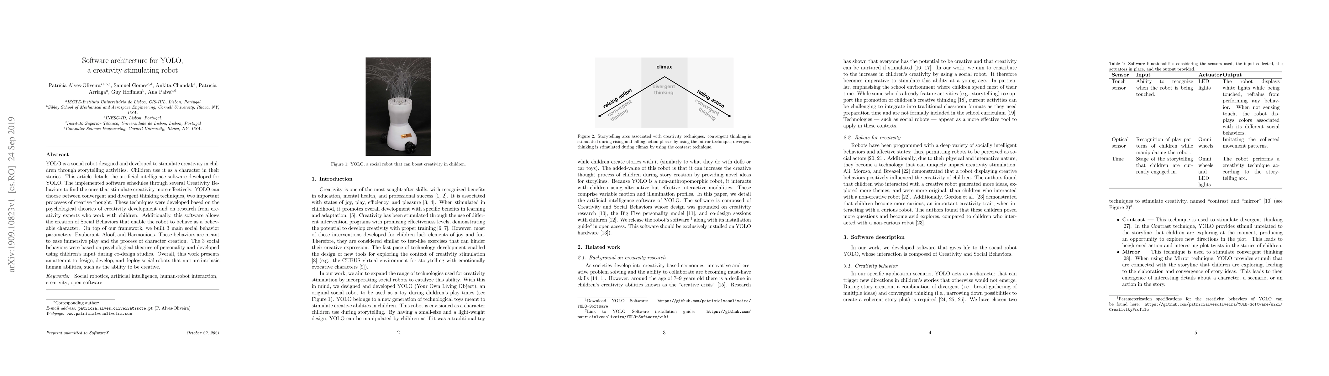YOLO is a social robot designed and developed to stimulate creativity in children through storytelling activities. Children use it as a character in their stories. This article details the artificial intelligence software developed for YOLO. The implemented software schedules through several Creativity Behaviors to find the ones that stimulate creativity more effectively. YOLO can choose between convergent and divergent thinking techniques, two important processes of creative thought. These techniques were developed based on the psychological theories of creativity development and on research from creativity experts who work with children. Additionally, this software allows the creation of Social Behaviors that enable the robot to behave as a believable character. On top of our framework, we built 3 main social behavior parameters: Exuberant, Aloof, and Harmonious. These behaviors are meant to ease immersive play and the process of character creation. The 3 social behaviors were based on psychological theories of personality and developed using children's input during co-design studies. Overall, this work presents an attempt to design, develop, and deploy social robots that nurture intrinsic human abilities, such as the ability to be creative.