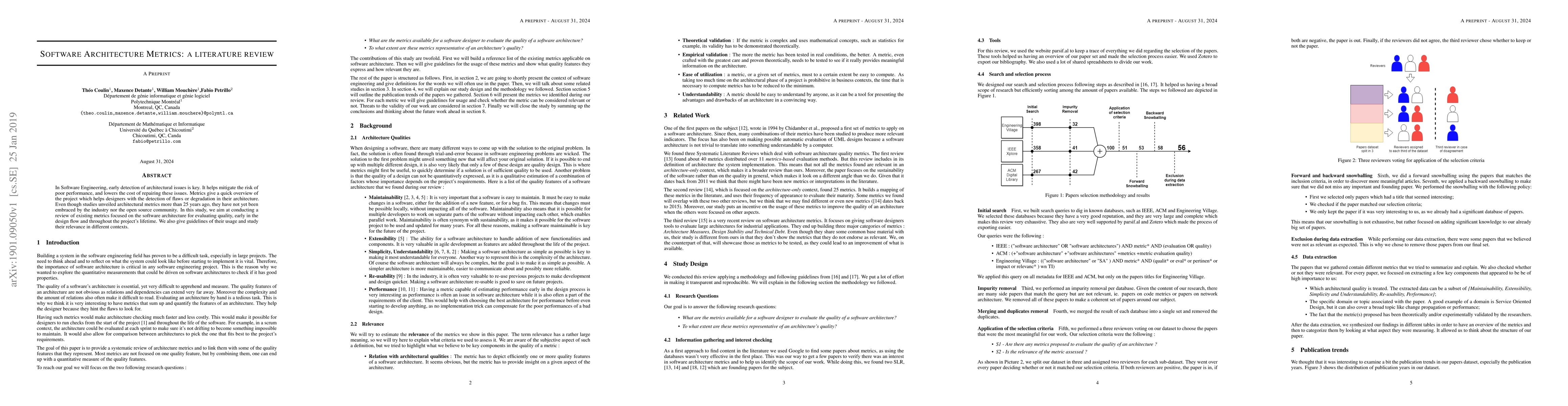 This paper reviews existing software architecture metrics to evaluate quality early in the design process and throughout a project's lifecycle, aiming to guide their usage and assess their relevance across different contexts, despite their long-standing existence, they remain underutilized in industry and open source.