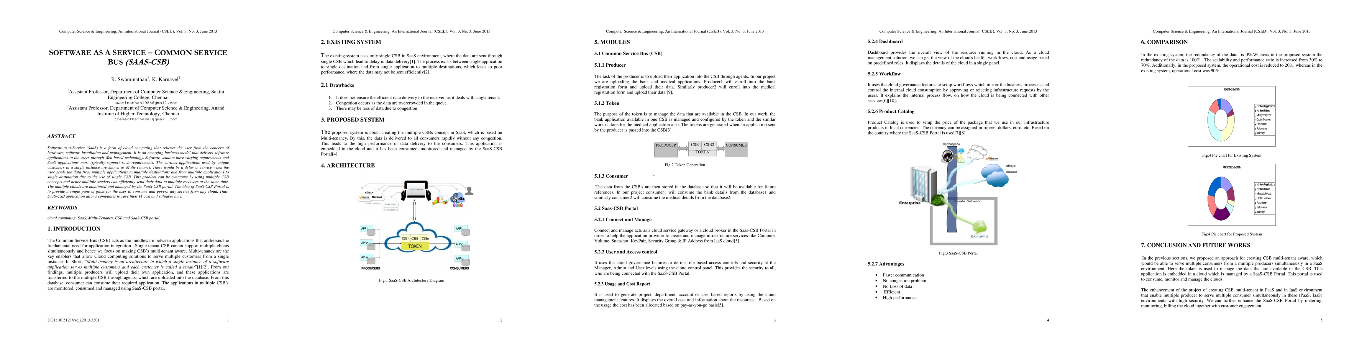 Software-as-a-Service (SaaS) is a form of cloud computing that relieves the user from the concern of hardware, software installation and management. It is an emerging business model that delivers software applications to the users through Web-based technology. Software vendors have varying requirements and SaaS applications most typically support such requirements. The various applications used by unique customers in a single instance are known as Multi-Tenancy. There would be a delay in service when the user sends the data from multiple applications to multiple destinations and from multiple applications to single destination due to the use of single CSB. This problem can be overcome by using multiple CSB concepts and hence multiple senders can efficiently send their data to multiple receivers at the same time. The multiple clouds are monitored and managed by the SaaS-CSB portal. The idea of SaaS-CSB Portal is to provide a single pane of glass for the user to consume and govern any service from any cloud. Thus, SaaS-CSB application allows companies to save their IT cost and valuable time.