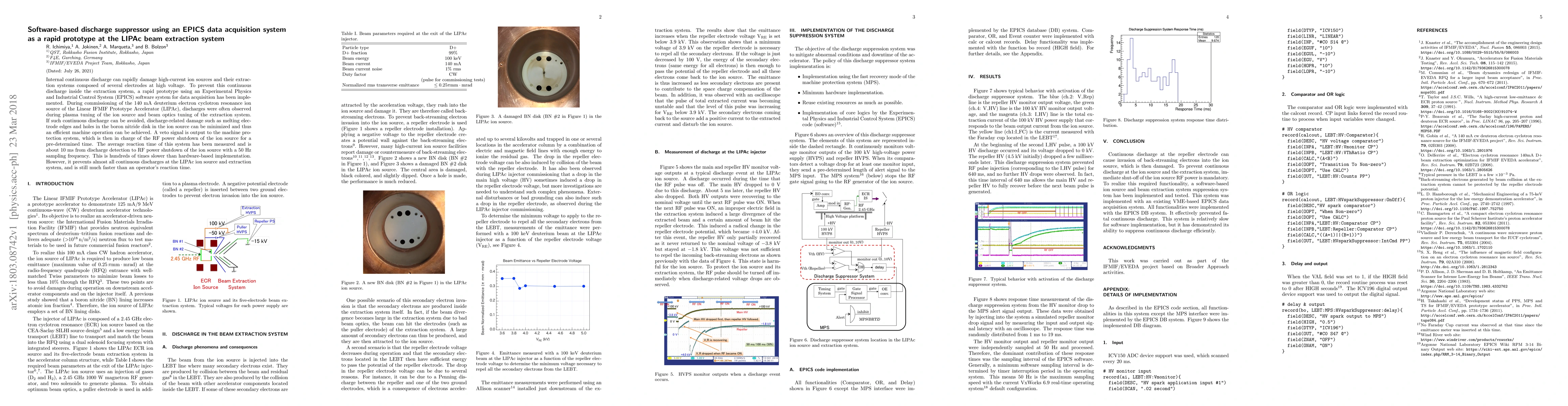 A software-based discharge suppressor was developed using an EPICS data acquisition system to prevent continuous discharges in a high-current ion source, achieving a reaction time of 10ms with a significant reduction in damage risk.