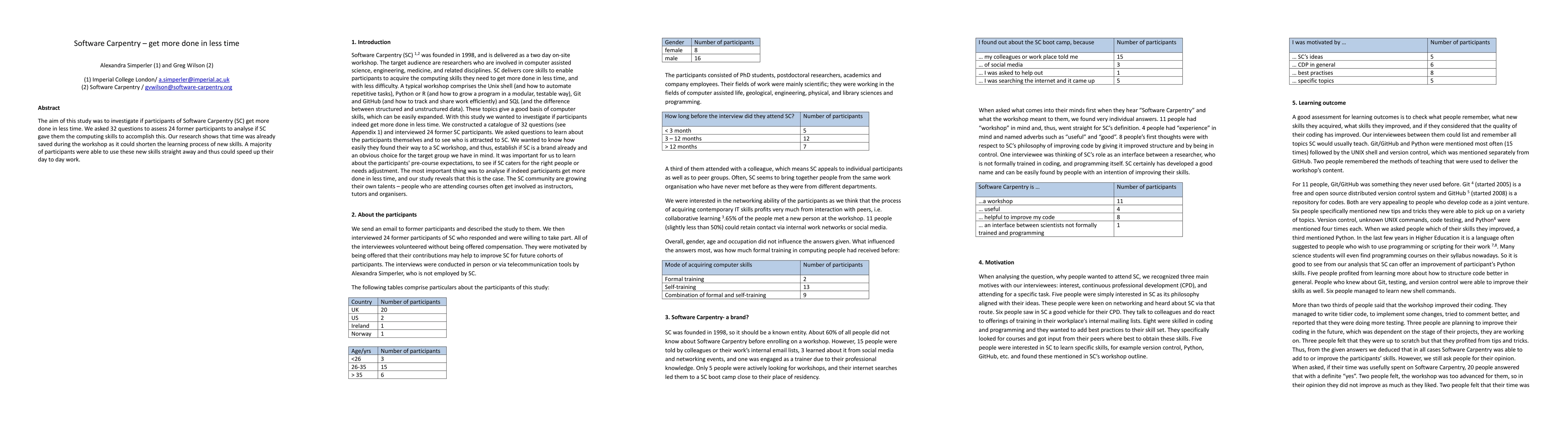 The aim of this study was to investigate if participants of Software Carpentry (SC) get more done in less time. We asked 32 questions to assess 24 former participants to analyse if SC gave them the computing skills to accomplish this. Our research shows that time was already saved during the workshop as it could shorten the learning process of new skills. A majority of participants were able to use these new skills straight away and thus could speed up their day to day work.