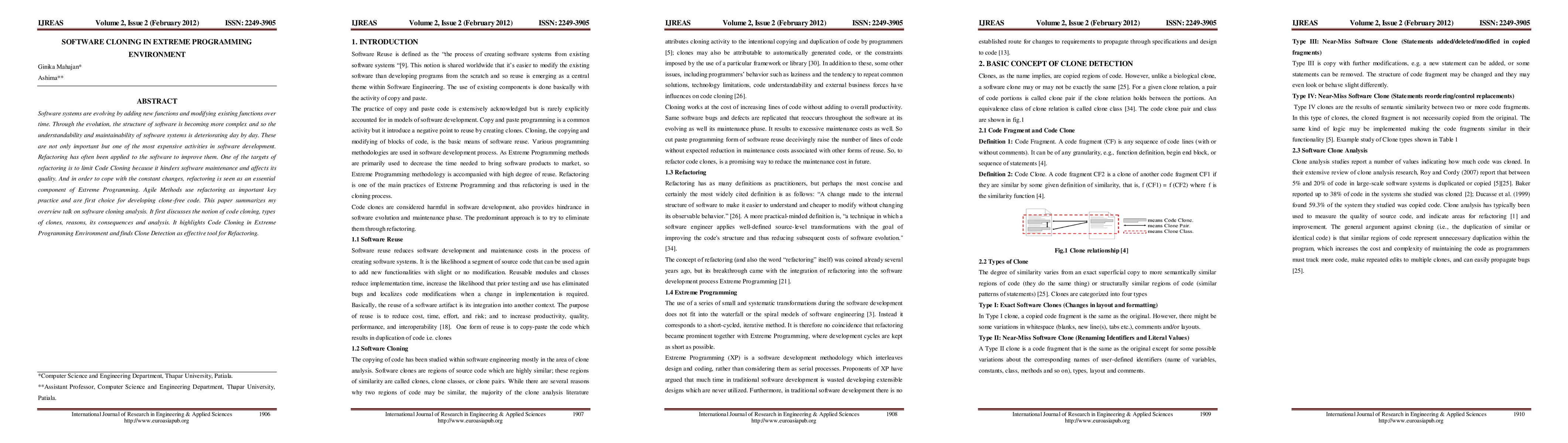 Software systems are evolving by adding new functions and modifying existing functions over time. Through the evolution, the structure of software is becoming more complex and so the understandability and maintainability of software systems is deteriorating day by day. These are not only important but one of the most expensive activities in software development. Refactoring has often been applied to the software to improve them. One of the targets of refactoring is to limit Code Cloning because it hinders software maintenance and affects its quality. And in order to cope with the constant changes, refactoring is seen as an essential component of Extreme Programming. Agile Methods use refactoring as important key practice and are first choice for developing clone-free code. This paper summarizes my overview talk on software cloning analysis. It first discusses the notion of code cloning, types of clones, reasons, its consequences and analysis. It highlights Code Cloning in Extreme Programming Environment and finds Clone Detection as effective tool for Refactoring.
