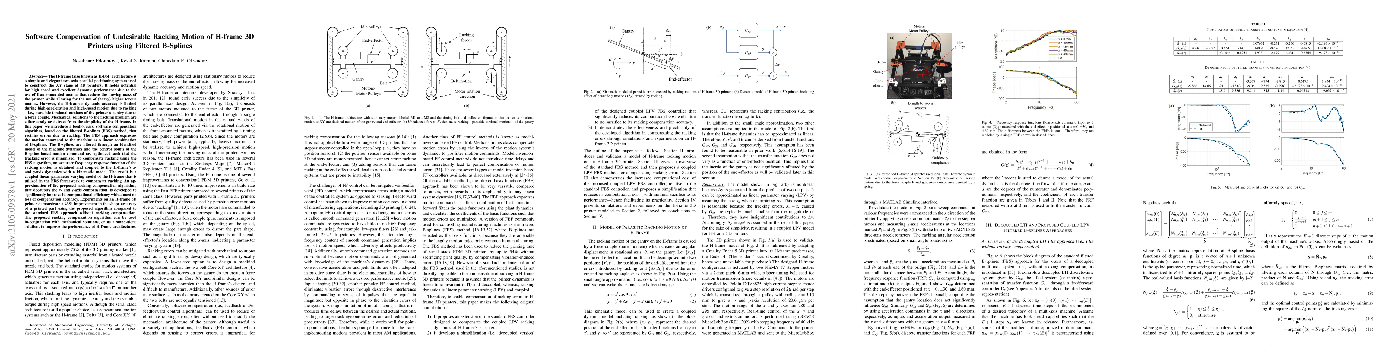 This paper proposes a software compensation algorithm using filtered B-splines to correct racking motion in H-frame 3D printers, improving shape accuracy by 43%. The filtered B-spline method optimizes control points to minimize tracking errors, and an approximation of the algorithm enhances computational efficiency.