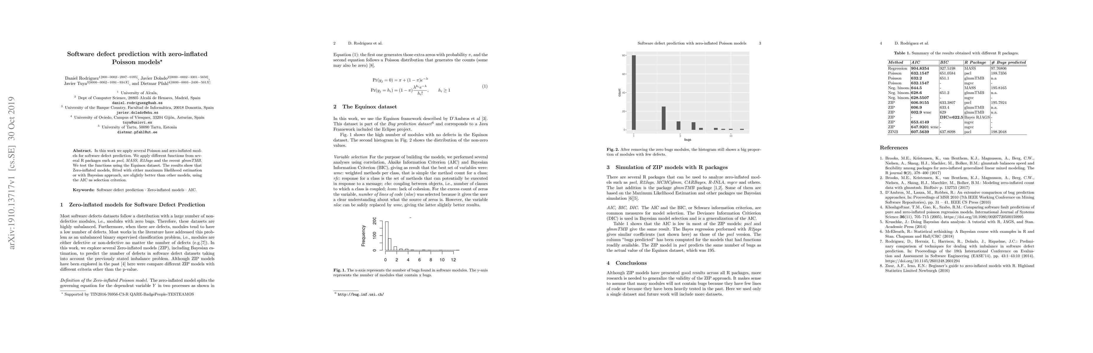 This research applies Poisson and zero-inflated models to predict software defects using the Equinox dataset. Zero-inflated models, evaluated with AIC, outperform other models, indicating their slight superiority in defect prediction.