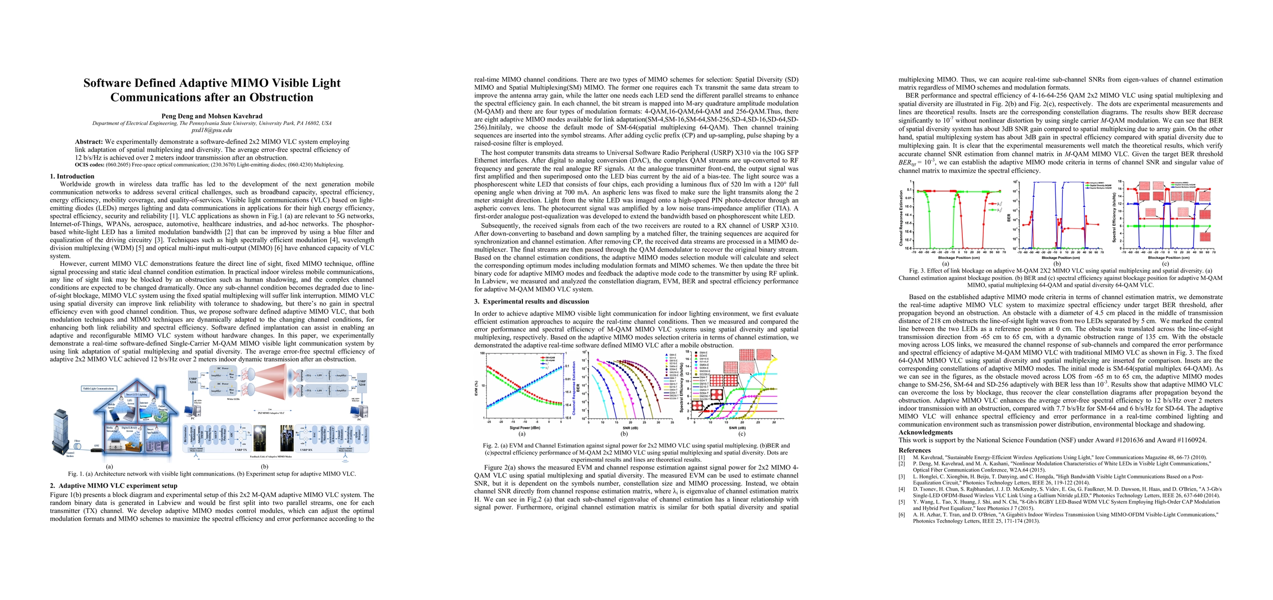Summary: This paper presents a software-defined 2x2 MIMO visible light communication system that uses adaptive spatial multiplexing and diversity, achieving an average error-free spectral efficiency of 12 b/s/Hz over 2 meters after an indoor obstruction.