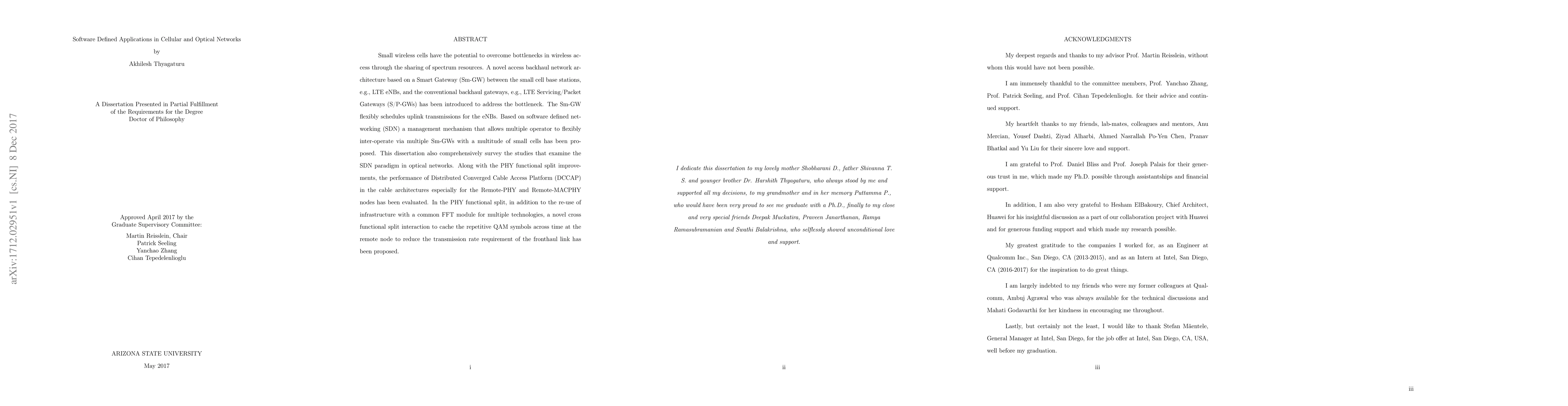 Small wireless cells have the potential to overcome bottlenecks in wireless access through the sharing of spectrum resources. A novel access backhaul network architecture based on a Smart Gateway (Sm-GW) between the small cell base stations, e.g., LTE eNBs, and the conventional backhaul gateways, e.g., LTE Servicing/Packet Gateways (S/P-GWs) has been introduced to address the bottleneck. The Sm-GW flexibly schedules uplink transmissions for the eNBs. Based on software defined networking (SDN) a management mechanism that allows multiple operator to flexibly inter-operate via multiple Sm-GWs with a multitude of small cells has been proposed. This dissertation also comprehensively survey the studies that examine the SDN paradigm in optical networks. Along with the PHY functional split improvements, the performance of Distributed Converged Cable Access Platform (DCCAP) in the cable architectures especially for the Remote-PHY and Remote-MACPHY nodes has been evaluated. In the PHY functional split, in addition to the re-use of infrastructure with a common FFT module for multiple technologies, a novel cross functional split interaction to cache the repetitive QAM symbols across time at the remote node to reduce the transmission rate requirement of the fronthaul link has been proposed.
