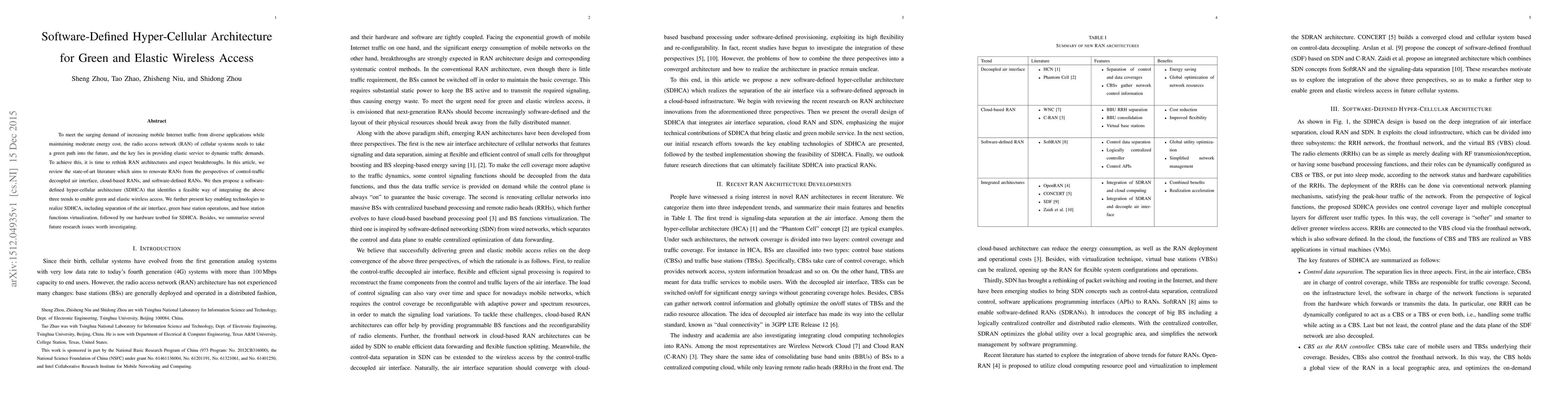 This paper reviews state-of-the-art literature on renovating radio access networks (RANs) to meet increasing mobile traffic while reducing energy costs. It proposes a software-defined hyper-cellular architecture (SDHCA) that integrates control-traffic decoupling, cloud-based RANs, and software-defined RANs to achieve green and elastic wireless access.