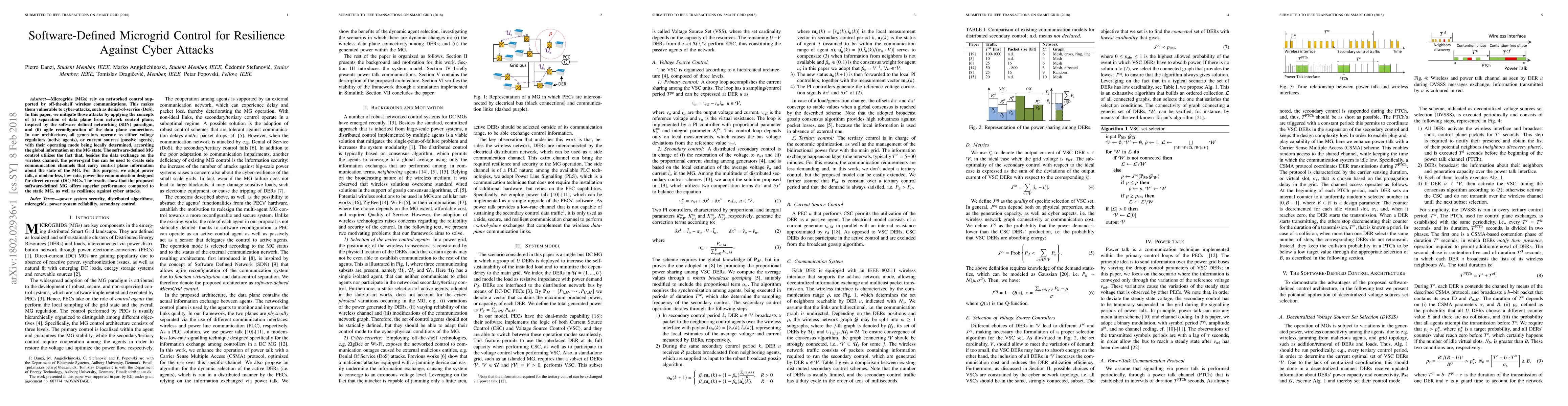 Microgrids (MGs) rely on networked control supported by off-the-shelf wireless communications. This makes them vulnerable to cyber-attacks, such as denial-of-service (DoS). In this paper, we mitigate those attacks by applying the concepts of (i) separation of data plane from network control plane, inspired by the software defined networking (SDN) paradigm, and (ii) agile reconfiguration of the data plane connections. In our architecture, all generators operate as either voltage regulators (active agents), or current sources (passive agents), with their operating mode being locally determined, according the global information on the MG state. The software-defined MG control utilizes the fact that, besides the data exchange on the wireless channel, the power-grid bus can be used to create side communication channels that carry control plane information about the state of the MG. For this purpose, we adopt power talk, a modem-less, low-rate, power-line communication designed for direct current (DC) MGs. The results show that the proposed software-defined MG offers superior performance compared to the static MG, as well as resilience against cyber attacks.
