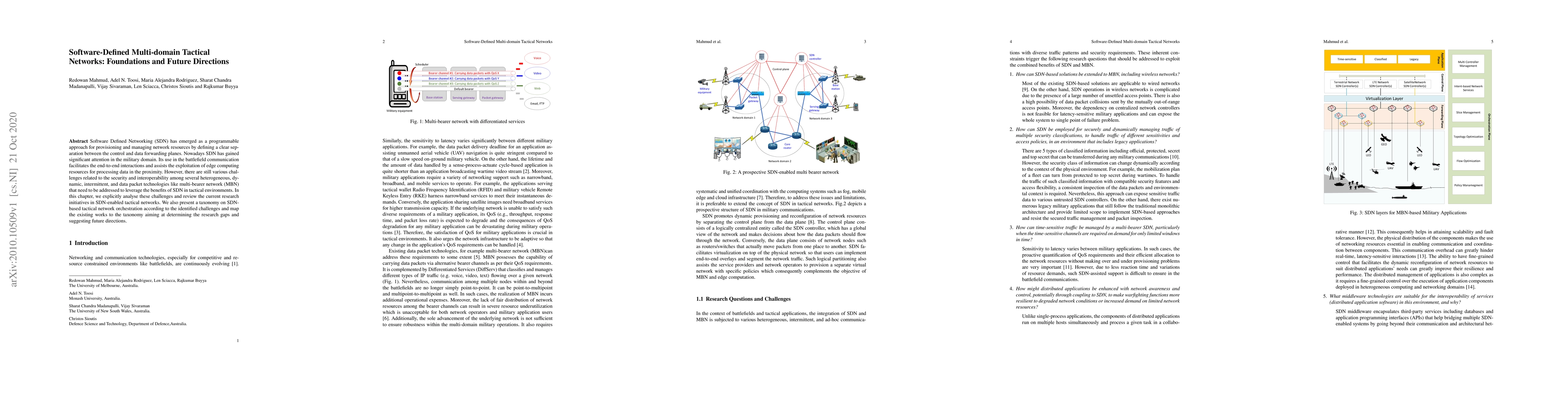 Software Defined Networking (SDN) has emerged as a programmable approach for provisioning and managing network resources by defining a clear separation between the control and data forwarding planes. Nowadays SDN has gained significant attention in the military domain. Its use in the battlefield communication facilitates the end-to-end interactions and assists the exploitation of edge computing resources for processing data in the proximity. However, there are still various challenges related to the security and interoperability among several heterogeneous, dynamic, intermittent, and data packet technologies like multi-bearer network (MBN) that need to be addressed to leverage the benefits of SDN in tactical environments. In this chapter, we explicitly analyse these challenges and review the current research initiatives in SDN-enabled tactical networks. We also present a taxonomy on SDN-based tactical network orchestration according to the identified challenges and map the existing works to the taxonomy aiming at determining the research gaps and suggesting future directions.