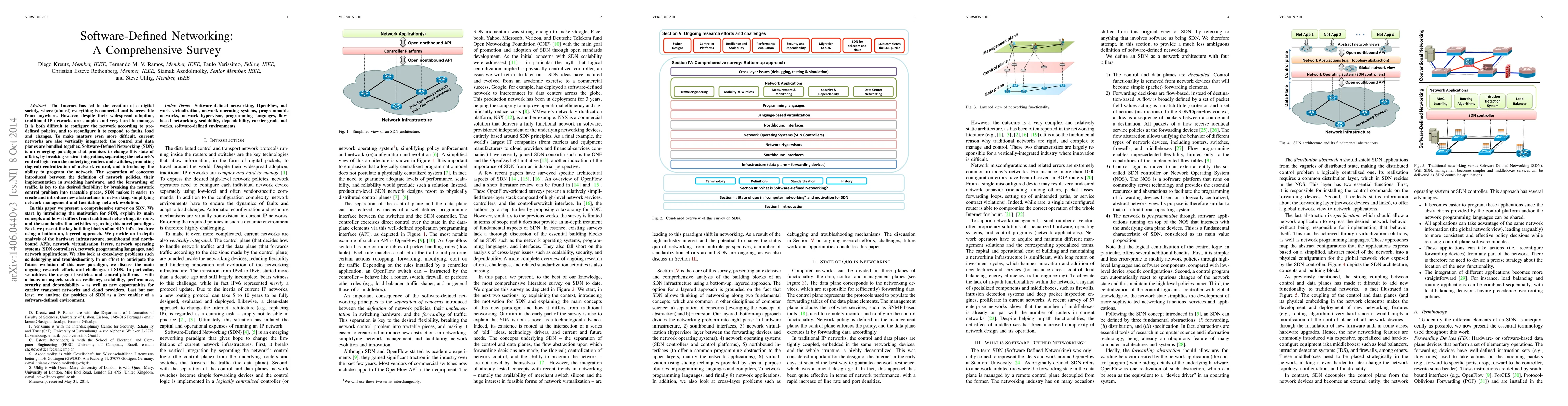 Software-Defined Networking (SDN) is an emerging paradigm that promises to change this state of affairs, by breaking vertical integration, separating the network's control logic from the underlying routers and switches, promoting (logical) centralization of network control, and introducing the ability to program the network. The separation of concerns introduced between the definition of network policies, their implementation in switching hardware, and the forwarding of traffic, is key to the desired flexibility: by breaking the network control problem into tractable pieces, SDN makes it easier to create and introduce new abstractions in networking, simplifying network management and facilitating network evolution. In this paper we present a comprehensive survey on SDN. We start by introducing the motivation for SDN, explain its main concepts and how it differs from traditional networking, its roots, and the standardization activities regarding this novel paradigm. Next, we present the key building blocks of an SDN infrastructure using a bottom-up, layered approach. We provide an in-depth analysis of the hardware infrastructure, southbound and northbound APIs, network virtualization layers, network operating systems (SDN controllers), network programming languages, and network applications. We also look at cross-layer problems such as debugging and troubleshooting. In an effort to anticipate the future evolution of this new paradigm, we discuss the main ongoing research efforts and challenges of SDN. In particular, we address the design of switches and control platforms -- with a focus on aspects such as resiliency, scalability, performance, security and dependability -- as well as new opportunities for carrier transport networks and cloud providers. Last but not least, we analyze the position of SDN as a key enabler of a software-defined environment.
