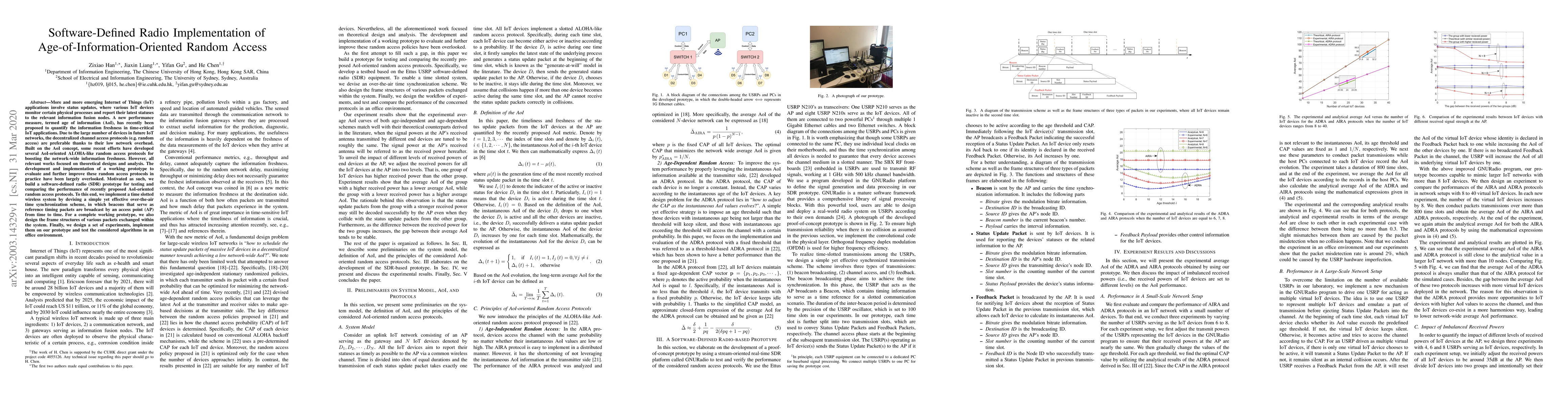 This paper presents a software-defined radio (SDR) prototype for evaluating AoI-oriented random access protocols in IoT networks. The authors implement a time-slotted wireless system with an over-the-air synchronization scheme and conduct experiments to compare the performance of these protocols in a practical office environment.