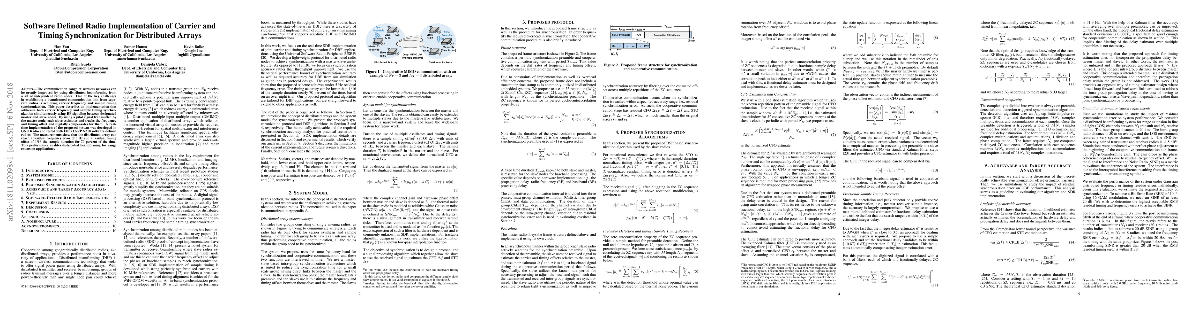This paper presents an implementation of carrier and timing synchronization for distributed radio arrays using software-defined radios, achieving a residual frequency error of 5 Hz and a timing offset of 1/16 sample duration, enabling effective distributed beamforming for wireless network range extension.