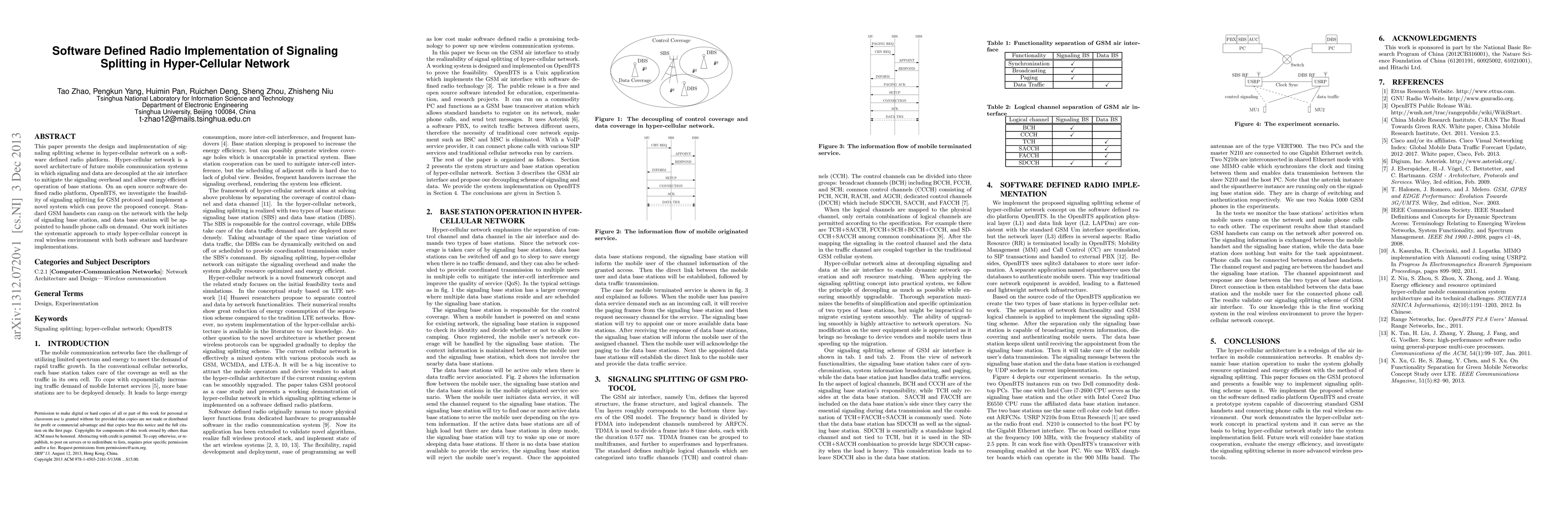 This paper implements a signaling splitting scheme in a hyper-cellular network using a software-defined radio platform, demonstrating the decoupling of signaling and data to reduce overhead and enhance base station efficiency. The study employs OpenBTS to validate the concept for GSM protocol, showing standard handsets can connect via a signaling base station while a dedicated data base station handles calls.