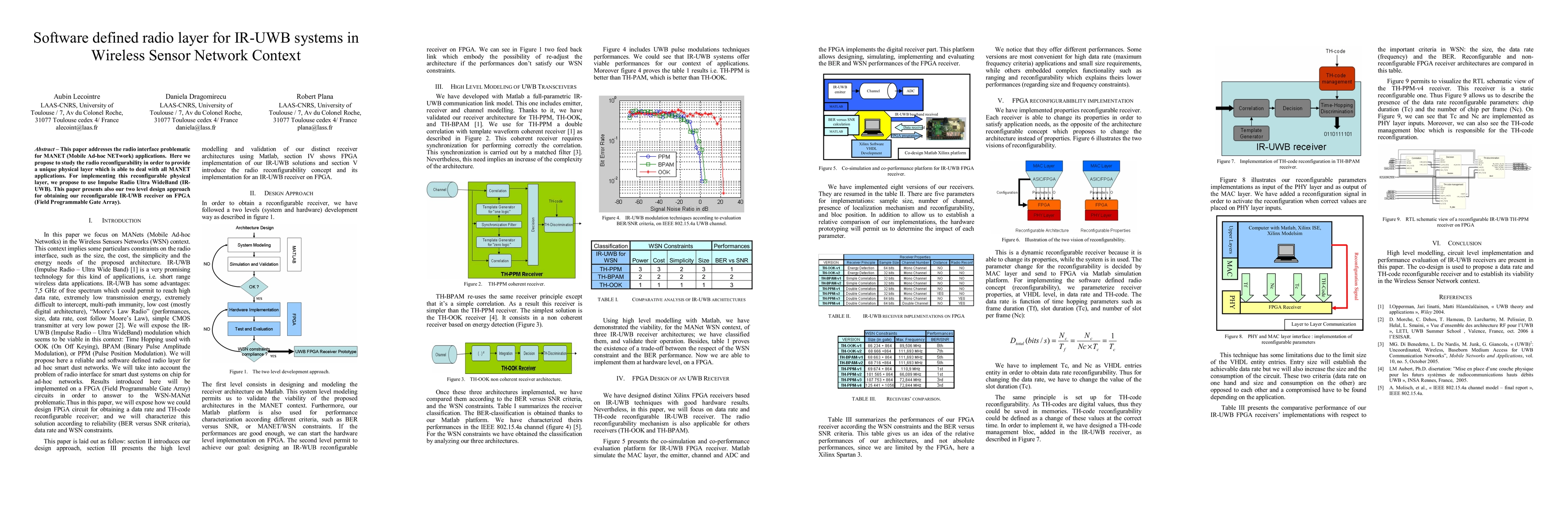 This paper addresses the radio interface problematic for MANET (Mobile Ad-hoc NETwork) applications. Here we propose to study the radio reconfigurability in order to provide a unique physical layer which is able to deal with all MANET applications. For implementing this reconfigurable physical layer, we propose to use Impulse Radio Ultra WideBand (IRUWB). This paper presents also our two level design approach for obtaining our reconfigurable IR-UWB receiver on FPGA (Field Programmable Gate Array).