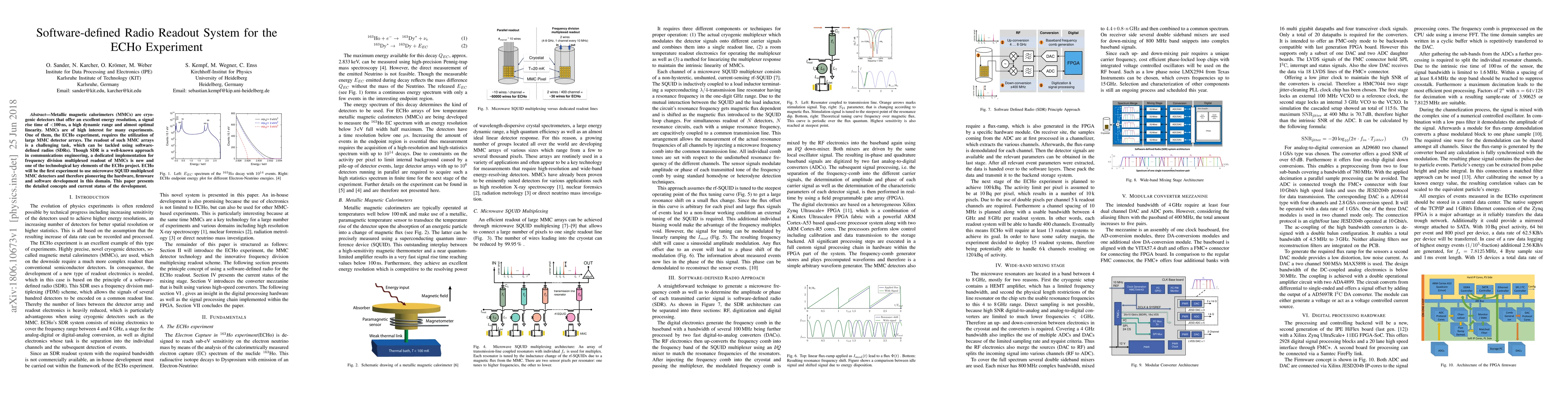 Metallic magnetic calorimeters (MMCs) are cryogenic detectors that offer an excellent energy resolution, a signal rise time of <100 ns, a high dynamic range and almost optimal linearity. MMCs are of high interest for many experiments. One of them, the ECHo experiment, requires the utilization of large MMC detector arrays. The readout of such MMC arrays is a challenging task, which can be tackled using software-defined radios (SDRs). Though SDR is a well-known approach in communications engineering, a dedicated implementation for frequency division multiplexed readout of MMCs is new and one of the technological key elements of the ECHo project. ECHo will be the first experiment to use microwave SQUID multiplexed MMC detectors and therefore pioneering the hardware, firmware and software development in this domain. This paper presents the detailed concepts and current status of the development.