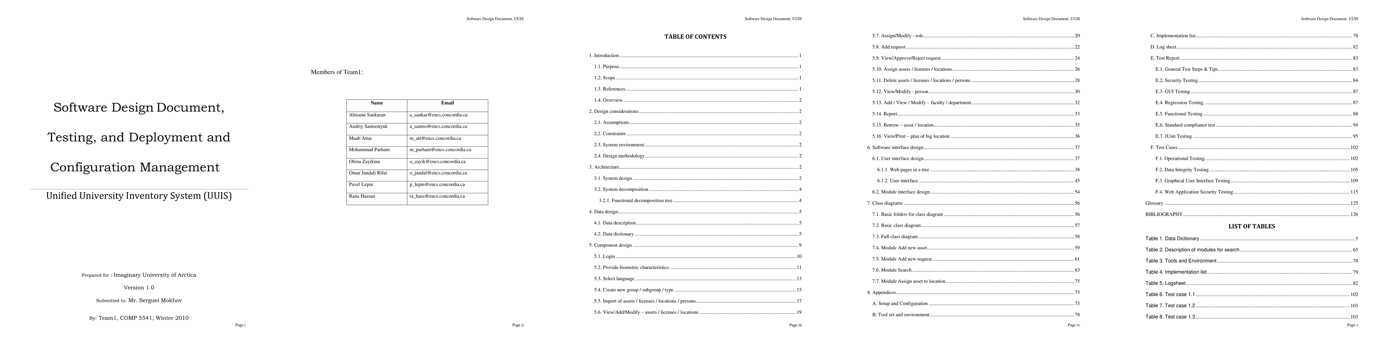 The document presents a detailed description of the designs for the implementation of the Unified University Inventory System for the Imaginary University of Arctica. The document, through numerous diagrams and UI samples, gives the structure of the system and the functions of its modules. It also gives test cases and reports that support the system's architecture and design.