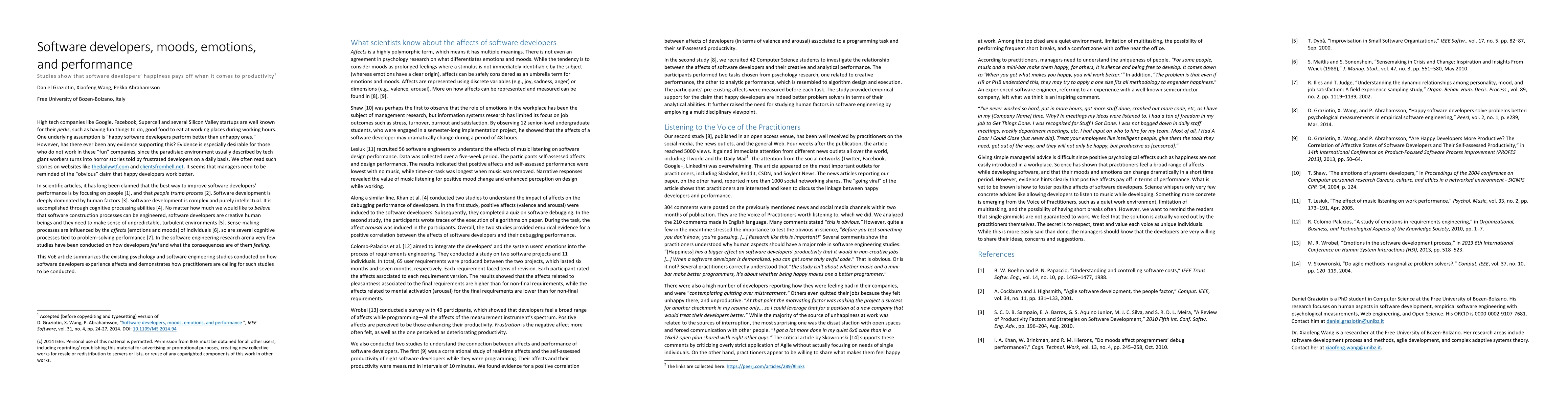 Studies show that software developers' happiness pays off when it comes to productivity.
