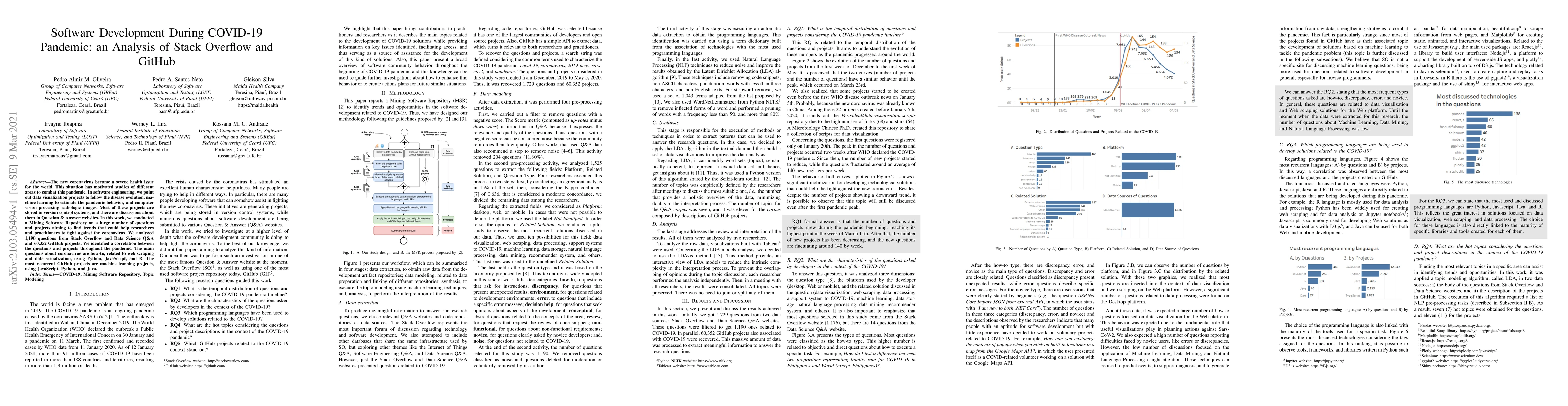 This study analyzes 1,190 questions from Stack Overflow and Data Science Q&A, alongside 60,352 GitHub projects, to identify trends in software development during the COVID-19 pandemic. Key findings include a focus on web scraping and data visualization, with Python, JavaScript, and R being the most popular languages.