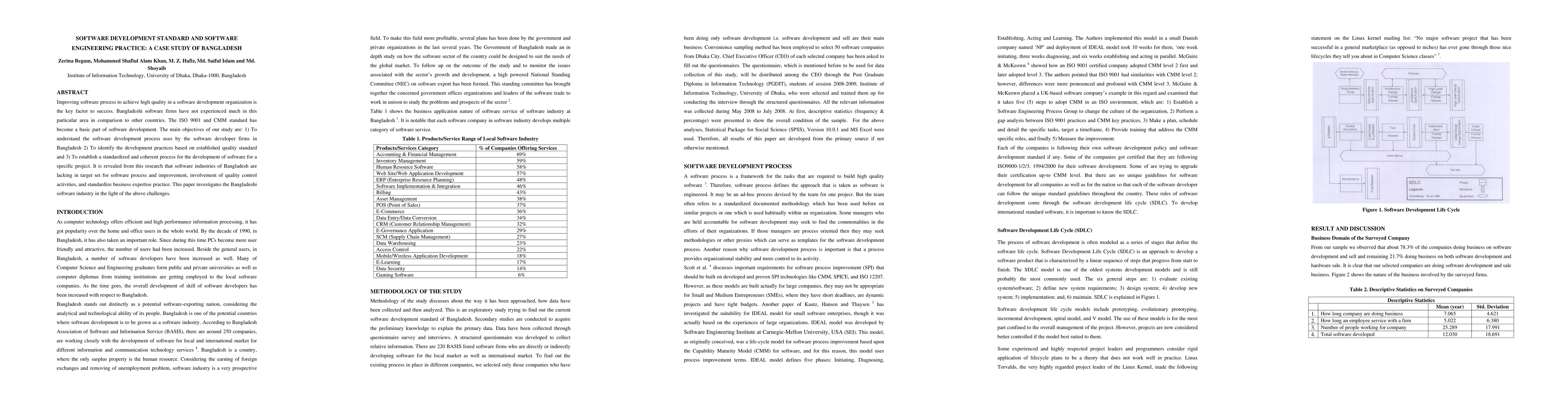 This study examines the software development practices in Bangladeshi firms, highlighting their lack of adherence to quality standards like ISO 9001 and CMM, and proposes a standardized process to improve software development quality. The research identifies deficiencies in process targeting, quality control, and business expertise.