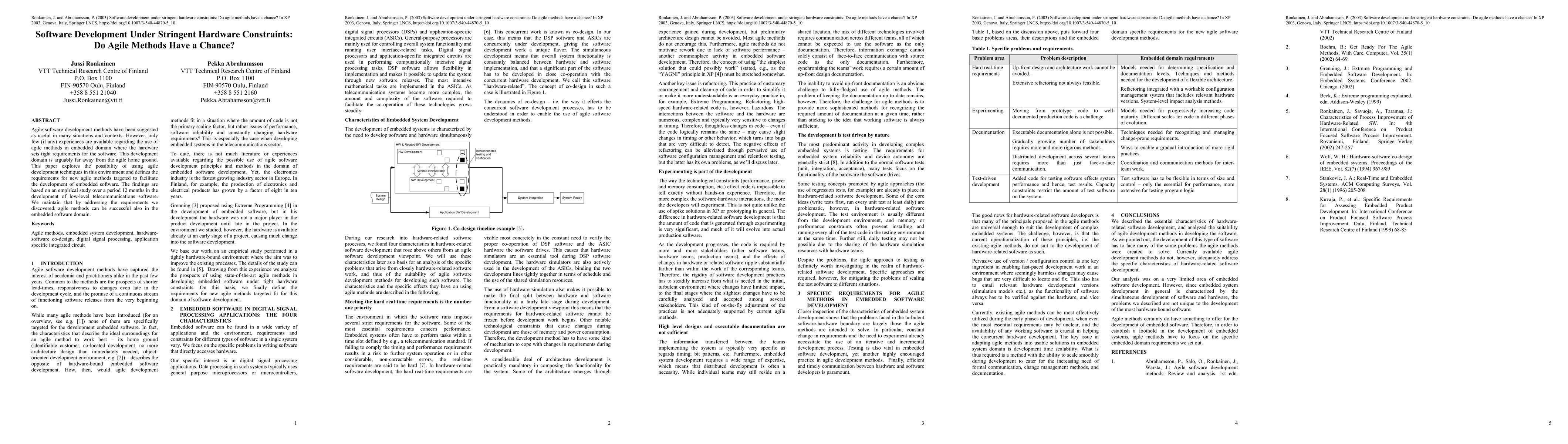 This paper investigates the viability of applying agile software development methods in the embedded domain, where hardware constraints are stringent. Through a 12-month empirical study on low-level telecommunications software, it identifies specific requirements for adapting agile techniques to this context, concluding that tailored agile methods can succeed in this challenging environment.