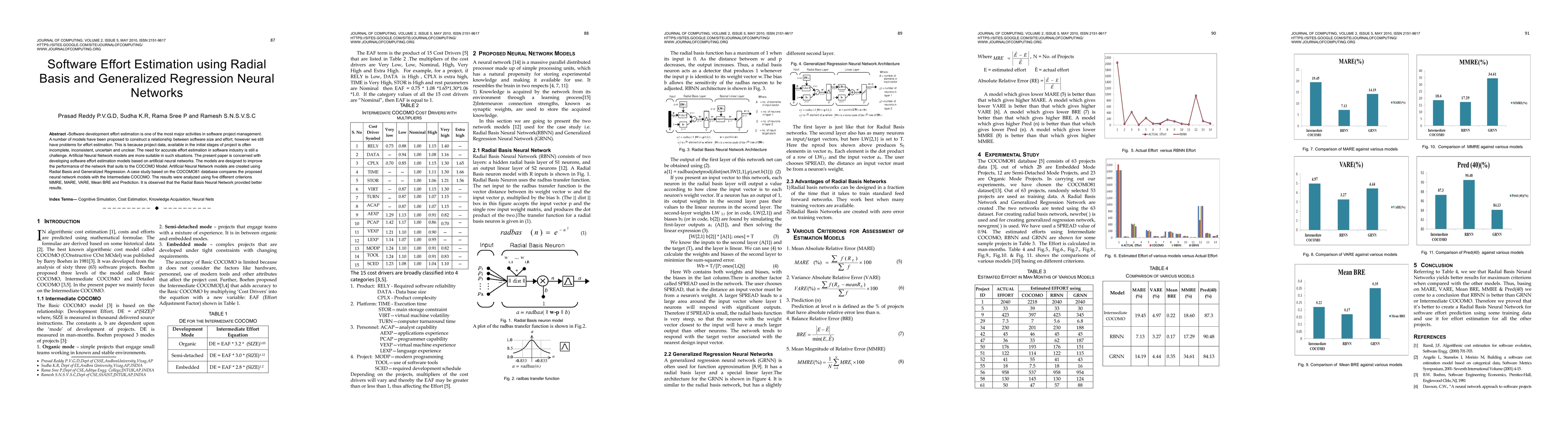 This paper develops software effort estimation models using Radial Basis and Generalized Regression Neural Networks to improve upon the COCOMO model. The study finds that the Radial Basis Neural Network outperforms the Intermediate COCOMO model based on multiple evaluation criteria.