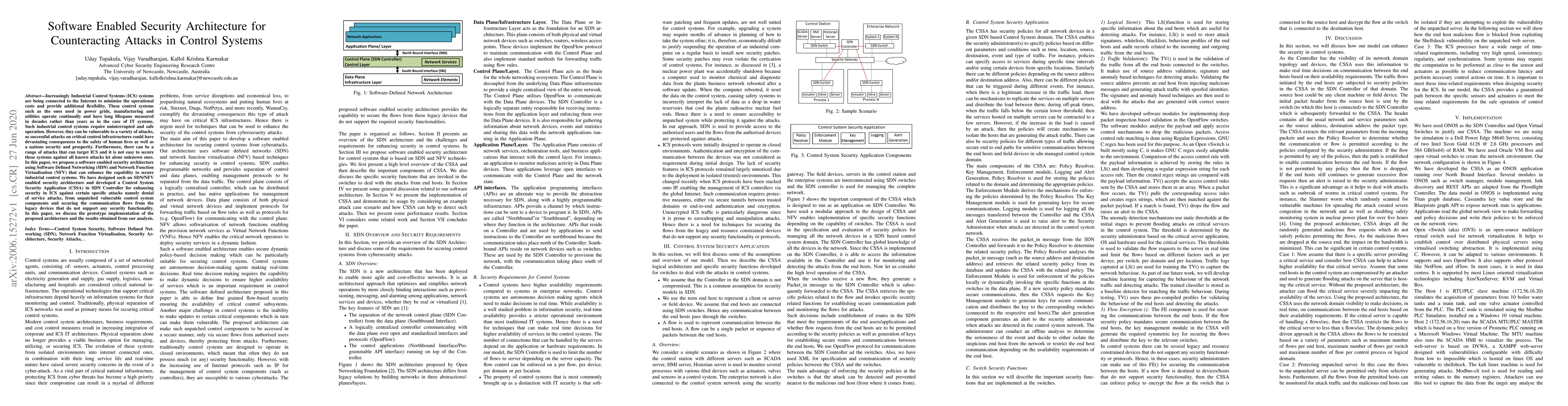 This paper proposes a software-enabled security architecture using SDN and NFV to enhance the security of Industrial Control Systems (ICS) against specific attacks like denial of service. The prototype implementation and analysis demonstrate the effectiveness of the proposed Control System Security Application (CSSA) in securing ICS.