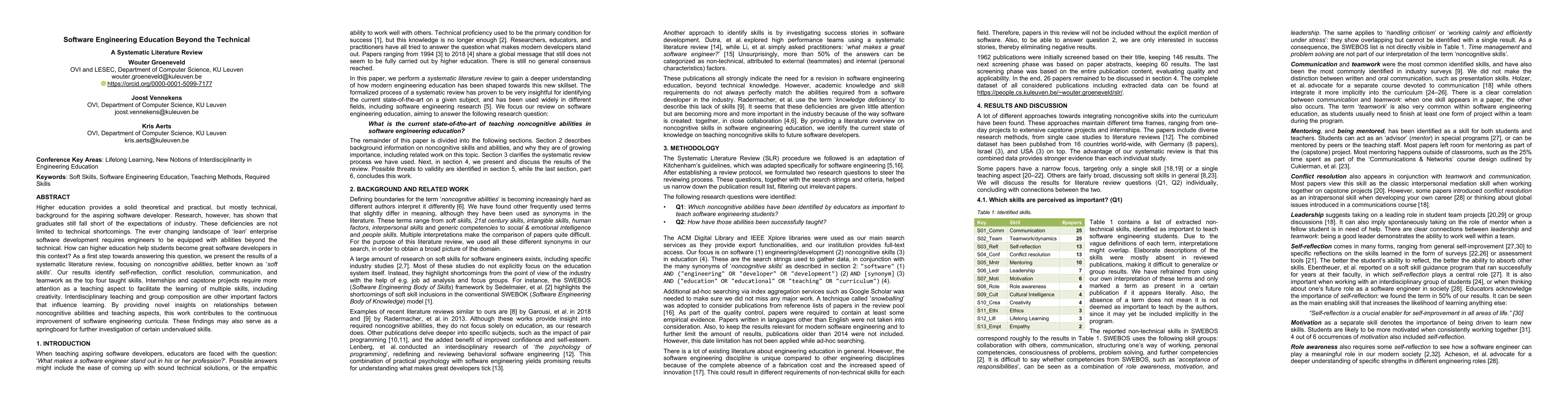 This paper conducts a systematic literature review to identify noncognitive "soft skills" taught in software engineering education, emphasizing self-reflection, conflict resolution, communication, and teamwork. It highlights the need for improved internships, capstone projects, interdisciplinary teaching, and group composition to better prepare students for the evolving demands of the software industry.