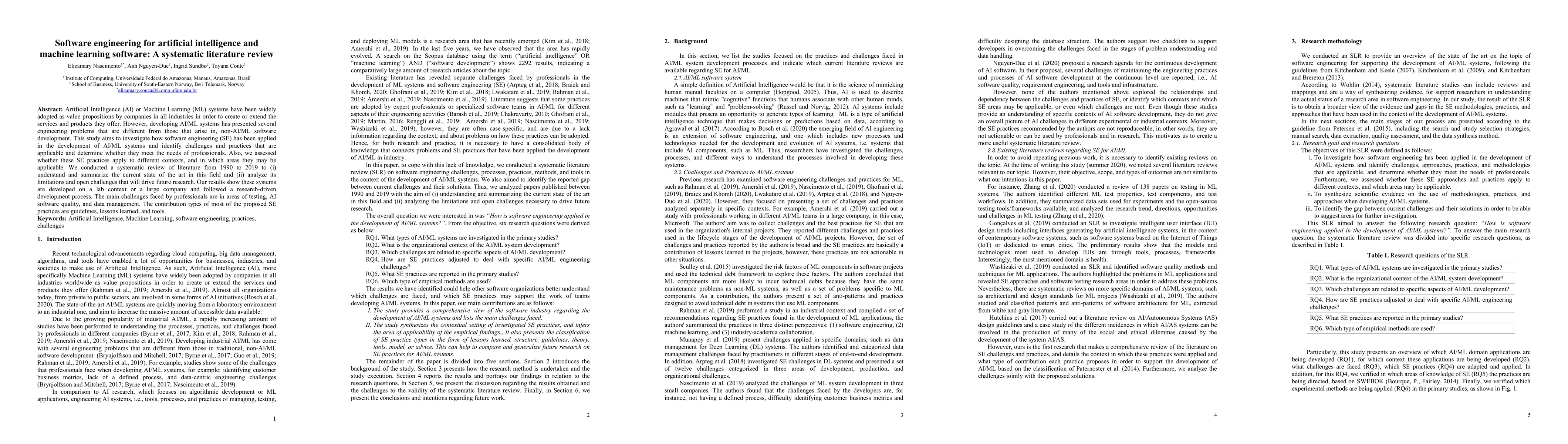 This paper systematically reviews literature on software engineering applied to AI/ML systems, identifying challenges in testing, AI software quality, and data management. The study finds that most SE practices are guidelines, lessons learned, and tools, and highlights the need for further research in these areas.
