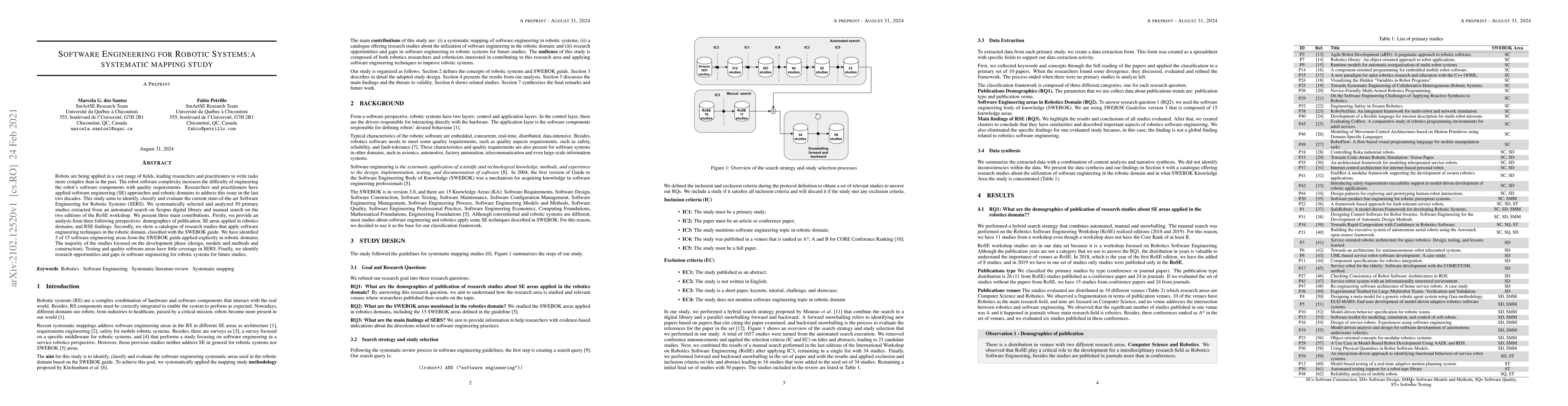 This study systematically maps the current state-of-the-art in Software Engineering for Robotic Systems (SERS), analyzing 50 primary studies to identify and classify SE approaches applied in robotics. It highlights the limited focus on testing and quality software areas, and identifies research opportunities and gaps for future studies.