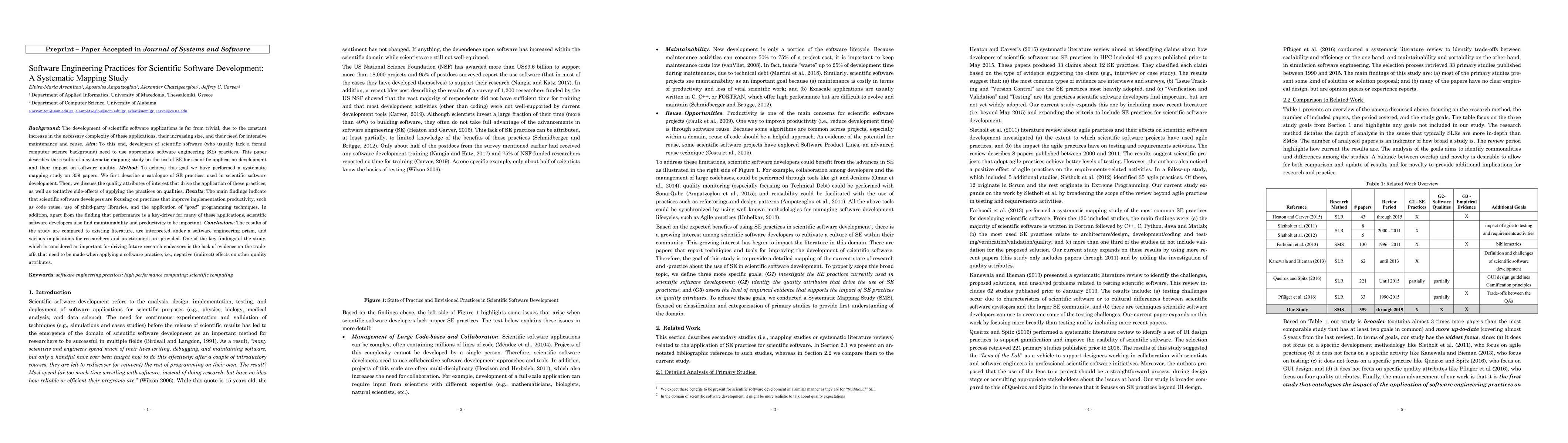 A systematic mapping study was conducted to identify and classify software engineering (SE) practices in scientific software development.