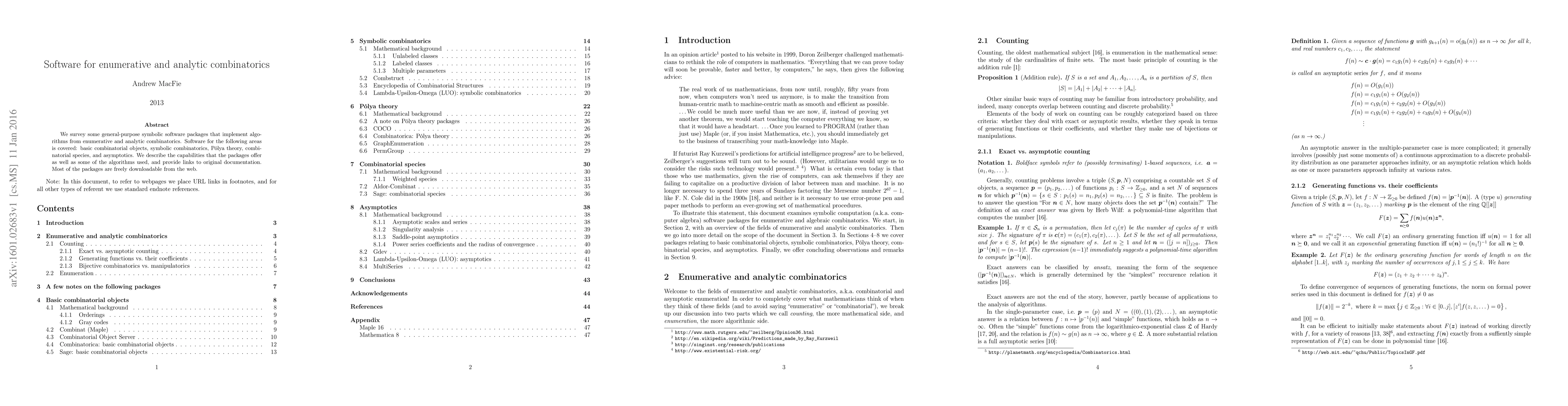 This paper surveys general-purpose symbolic software for enumerative and analytic combinatorics, covering areas like basic combinatorial objects and Pólya theory. It details the capabilities of these packages and provides links to their documentation, most of which are freely available online.