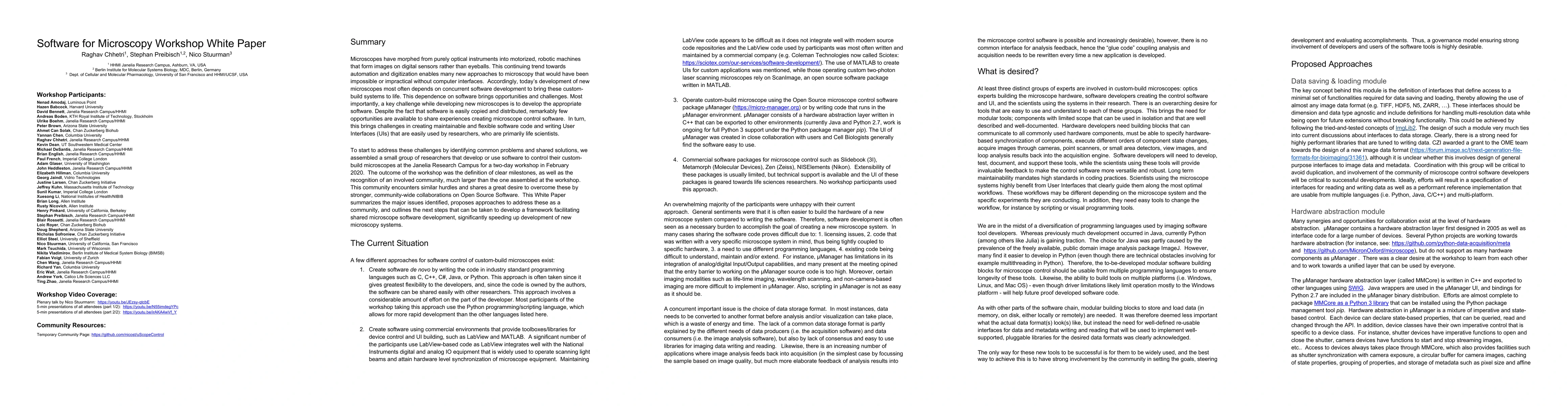 Microscopes have morphed from purely optical instruments into motorized, robotic machines that form images on digital sensors rather than eyeballs. This continuing trend towards automation and digitization enables many new approaches to microscopy that would have been impossible or impractical without computer interfaces. Accordingly, todays development of new microscopes most often depends on concurrent software development to bring these custom-build systems to life. This dependence on software brings opportunities and challenges. Most importantly, a key challenge while developing new microscopes is to develop the appropriate software. Despite the fact that software is easily copied and distributed, remarkably few opportunities are available to share experiences creating microscope control software. In turn, this brings challenges in creating maintainable and flexible software code and writing User Interfaces (UIs) that are easily used by researchers, who are primarily life scientists. To start to address these challenges by identifying common problems and shared solutions, we assembled a small group of researchers that develop or use software to control their custom-build microscopes at the Janelia Research Campus for a two-day workshop in February 2020. The outcome of the workshop was the definition of clear milestones, as well as the recognition of an involved community, much larger than the one assembled at the workshop. This community encounters similar hurdles and shares a great desire to overcome these by stronger, community-wide collaborations on Open Source Software. This White Paper summarizes the major issues identified, proposes approaches to address these as a community, and outlines the next steps that can be taken to develop a framework facilitating shared microscope software development, significantly speeding up development of new microscopy systems.