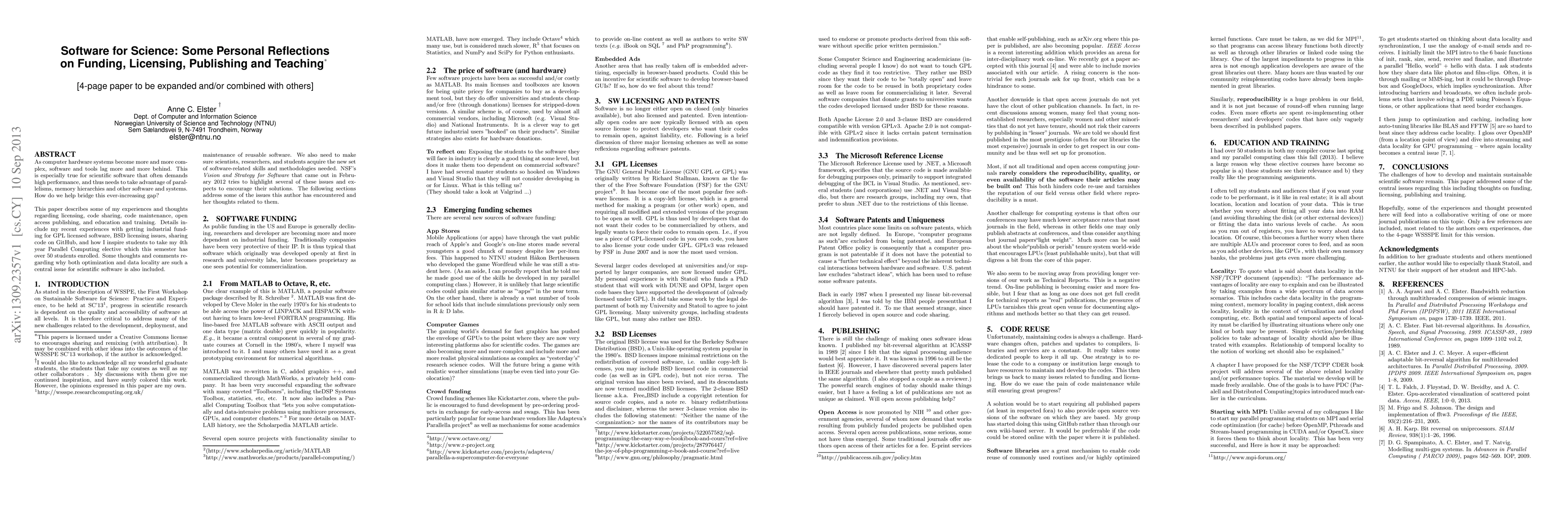 This paper reflects on the challenges of keeping scientific software up to date with complex computer systems, emphasizing the importance of parallelism and memory hierarchies. The author shares insights on licensing, code sharing, and education, including experiences with industrial funding for GPL software and student engagement in a Parallel Computing course.