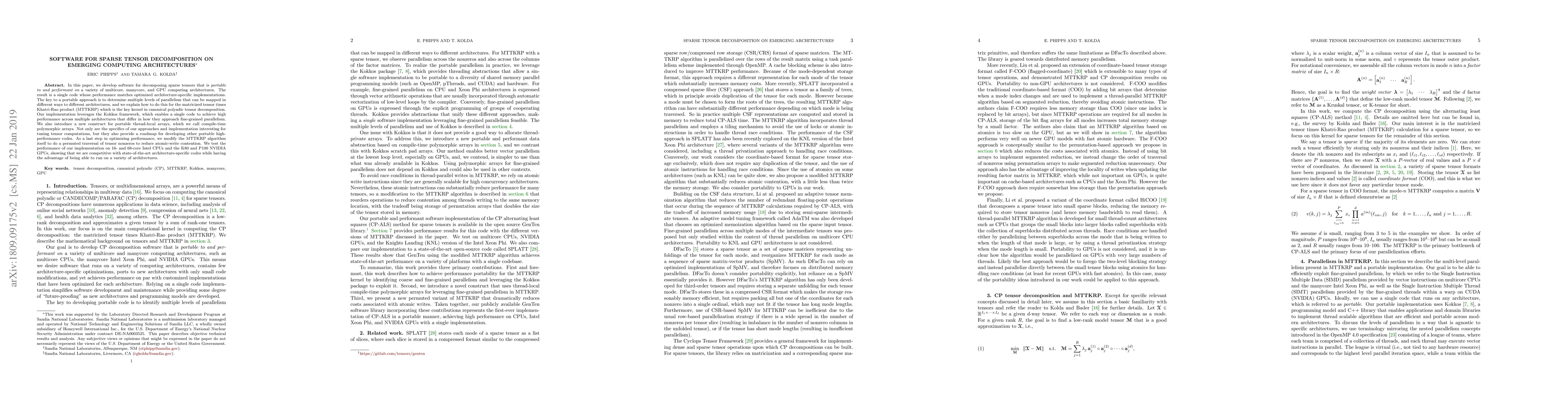 This paper presents software for efficient sparse tensor decomposition that is portable across multicore, manycore, and GPU architectures, achieving performance comparable to optimized architecture-specific implementations. The authors introduce a new approach using the Kokkos framework and compile-time polymorphic arrays to enable high performance on diverse hardware, and they optimize the MTTKRP algorithm to reduce contention.