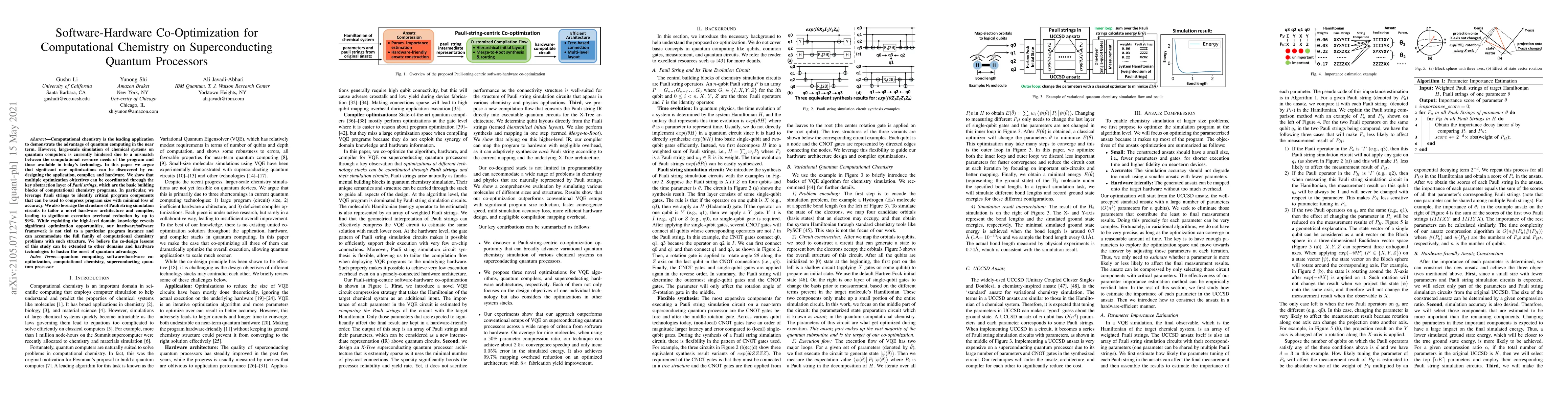 This paper explores software-hardware co-optimization for computational chemistry on superconducting quantum processors, demonstrating significant reductions in execution overhead through the use of Pauli strings to optimize both program size and hardware architecture. The proposed framework is versatile, accommodating a range of computational chemistry problems and potentially extending to other domains and technologies.