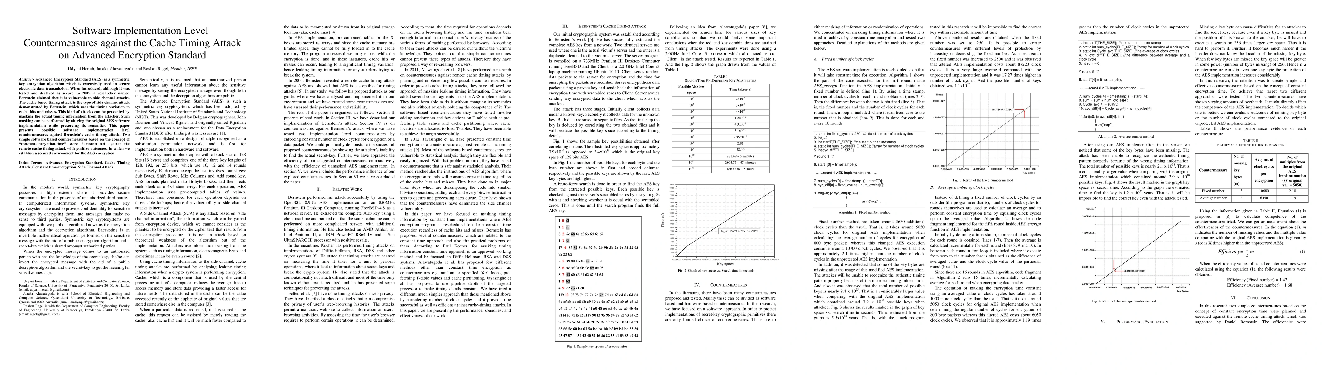 This paper explores software-level countermeasures to defend against cache timing attacks on the Advanced Encryption Standard (AES). It proposes two "constant-encryption-time" based software modifications that effectively mask timing information, successfully creating a secure environment for AES encryption.