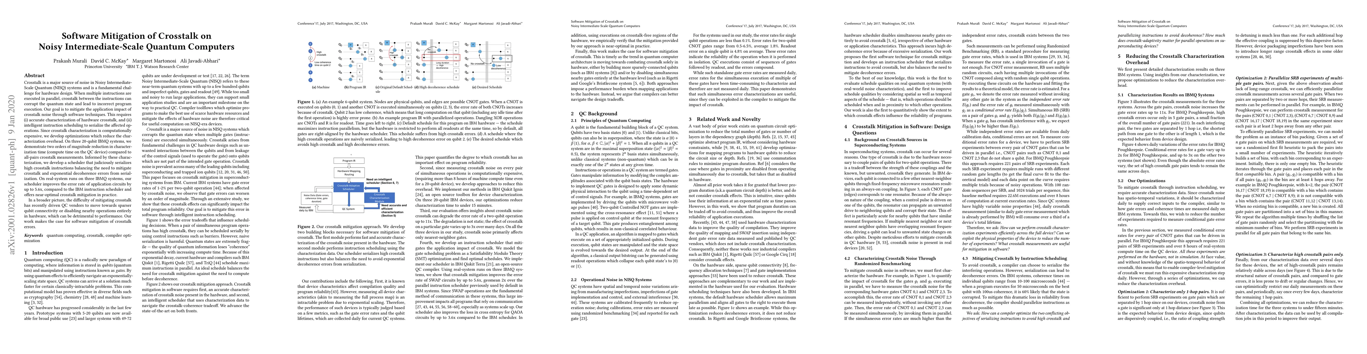 This paper proposes software techniques to mitigate crosstalk noise in Noisy Intermediate-Scale Quantum (NISQ) systems, achieving significant reductions in characterization time and improving error rates by up to 5.6x through optimized instruction scheduling, advocating for software-based solutions over hardware changes.