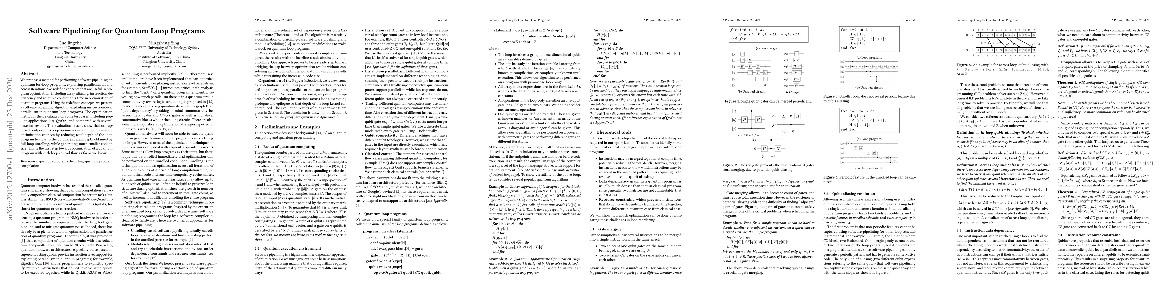 This paper introduces a novel software pipelining method for optimizing quantum for-loop programs, redefining concepts like array aliasing and instruction dependency for quantum contexts. The proposed optimization reduces loop program depth and generates smaller code, outperforming baseline methods in evaluations.