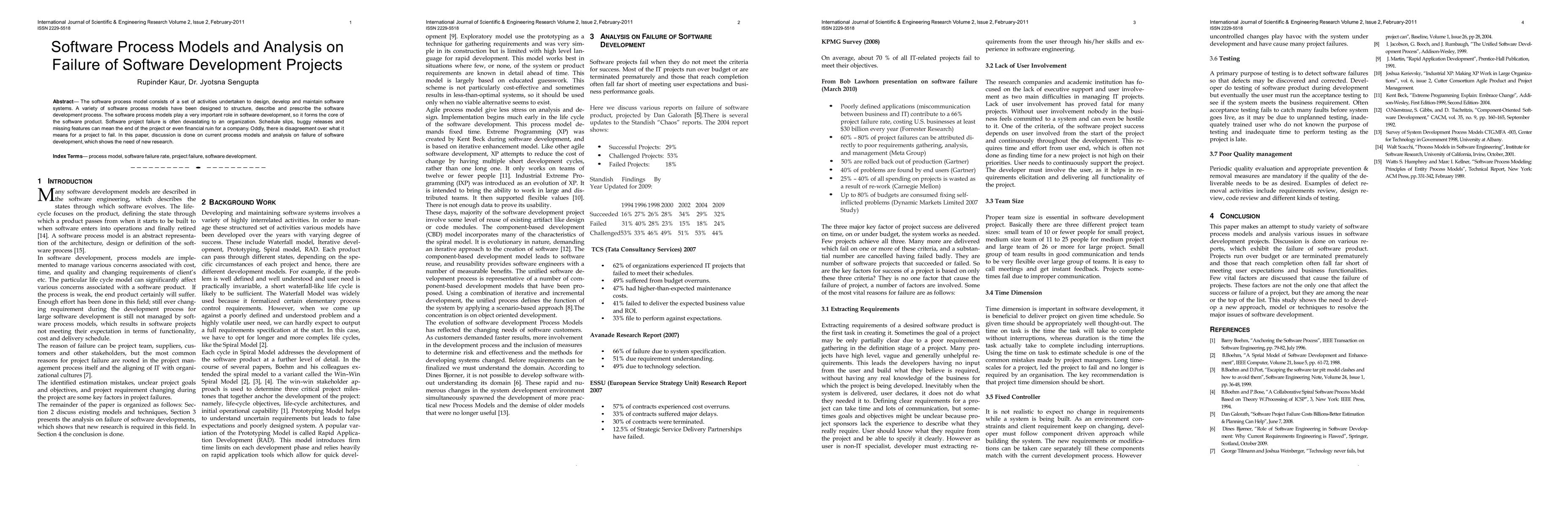 This paper discusses various software process models and analyzes the reasons behind software development project failures, highlighting the need for further research to address these issues. Despite the importance of process models, project failures remain a significant challenge, often leading to severe organizational consequences.
