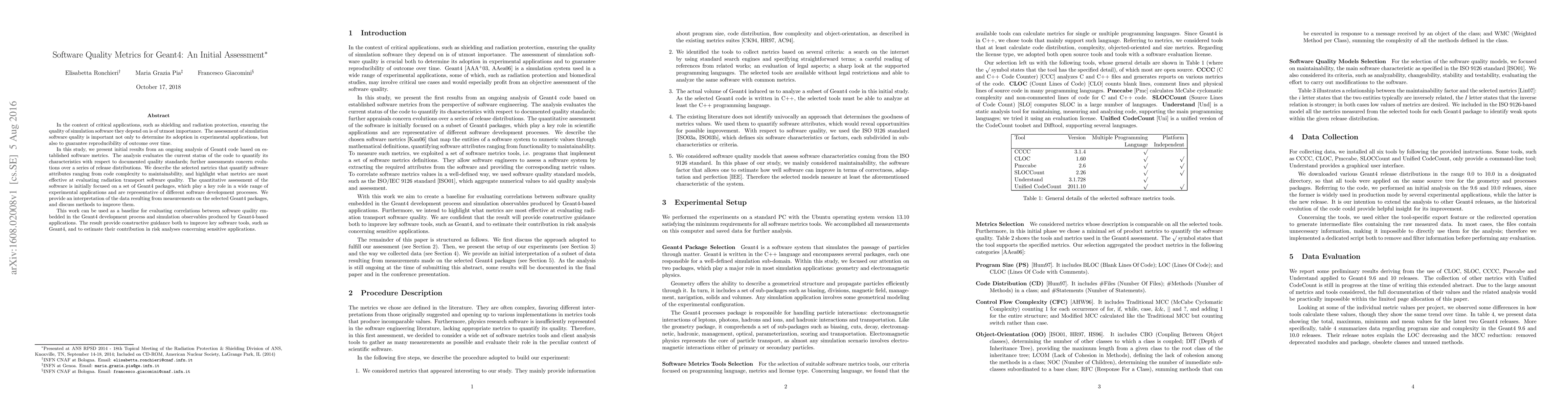 This study assesses the quality of Geant4 simulation software using established software metrics, focusing on code complexity and maintainability. Initial findings provide a baseline for future evaluations and suggest improvements to enhance the software's reliability and reproducibility in critical applications.