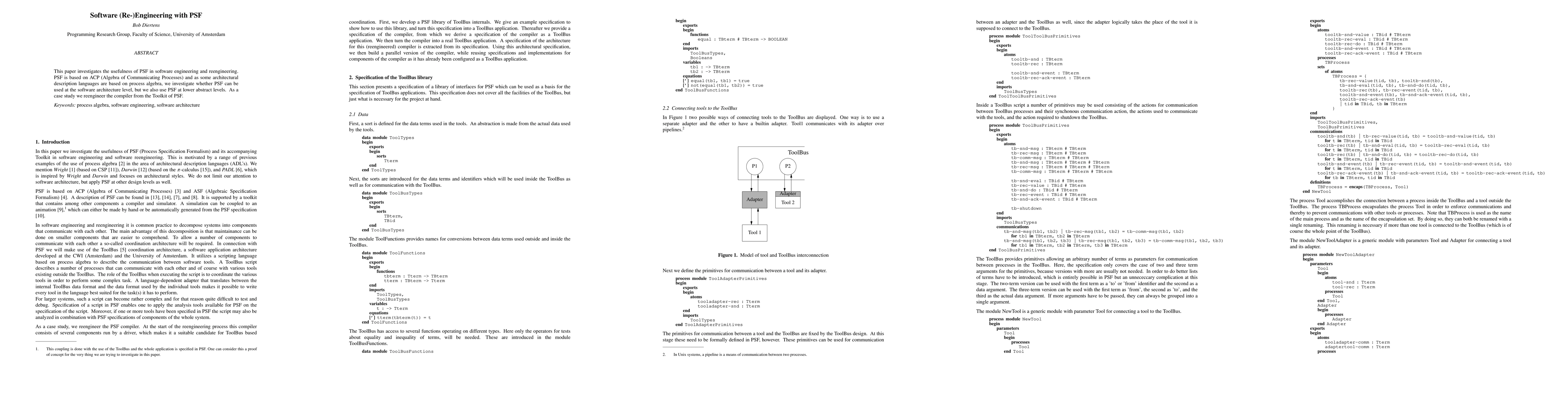 This paper investigates the usefulness of PSF in software engineering and reengineering. PSF is based on ACP (Algebra of Communicating Processes) and as some architectural description languages are based on process algebra, we investigate whether PSF can be used at the software architecture level, but we also use PSF at lower abstract levels. As a case study we reengineer the compiler from the Toolkit of PSF.
