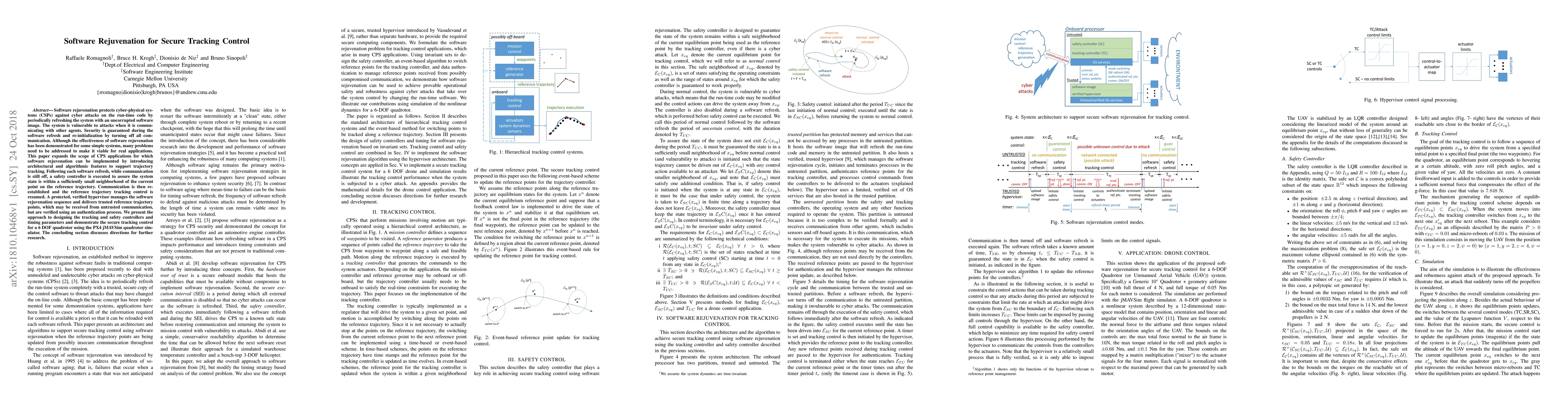 Software rejuvenation protects cyber-physical systems (CSPs) against cyber attacks on the run-time code by periodically refreshing the system with an uncorrupted software image. The system is vulnerable to attacks when it is communicating with other agents. Security is guaranteed during the software refresh and re-initialization by turning off all communication. Although the effectiveness of software rejuvenation has been demonstrated for some simple systems, many problems need to be addressed to make it viable for real applications. This paper expands the scope of CPS applications for which software rejuvenation can be implemented by introducing architectural and algorithmic features to support trajectory tracking. Following each software refresh, while communication is still off, a safety controller is executed to assure the system state is within a sufficiently small neighborhood of the current point on the reference trajectory. Communication is then re-established and the reference trajectory tracking control is resumed. A protected, verified hypervisor manages the software rejuvenation sequence and delivers trusted reference trajectory points, which may be received from untrusted communication, but are verified using an authentication process. We present the approach to designing the tracking and safety controllers and timing parameters and demonstrate the secure tracking control for a 6 DOF quadrotor using the PX4 jMAVSim quadrotor simulator. The concluding section discusses directions for further research.