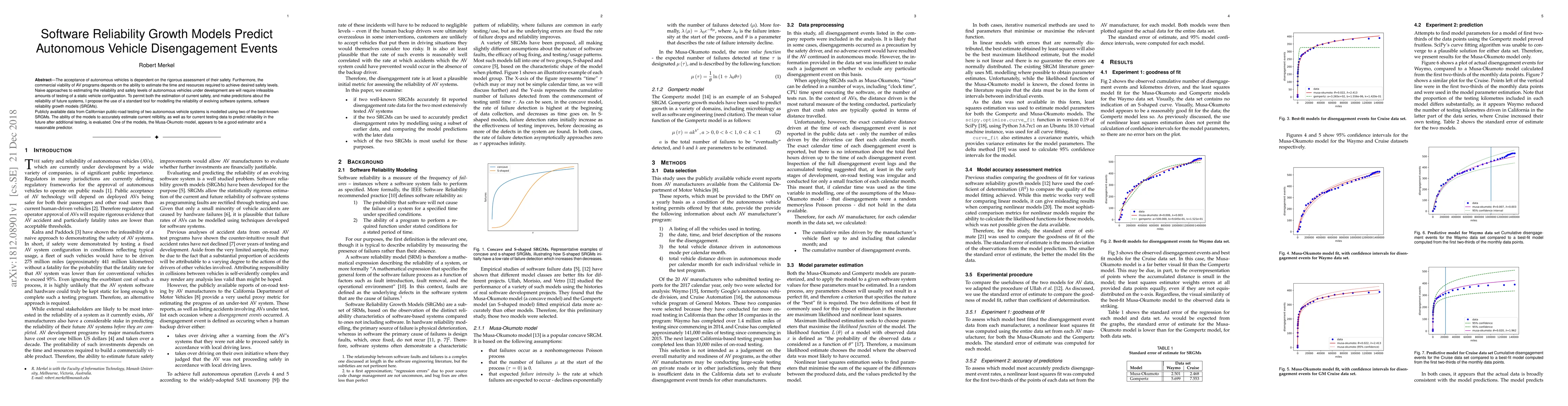 The acceptance of autonomous vehicles is dependent on the rigorous assessment of their safety. Furthermore, the commercial viability of AV programs depends on the ability to estimate the time and resources required to achieve desired safety levels. Naive approaches to estimating the reliability and safety levels of autonomous vehicles under development are will require infeasible amounts of testing of a static vehicle configuration. To permit both the estimation of current safety, and make predictions about the reliability of future systems, I propose the use of a standard tool for modelling the reliability of evolving software systems, software reliability growth models (SRGMs). Publicly available data from Californian public-road testing of two autonomous vehicle systems is modelled using two of the best-known SRGMs. The ability of the models to accurately estimate current reliability, as well as for current testing data to predict reliability in the future after additional testing, is evaluated. One of the models, the Musa-Okumoto model, appears to be a good estimator and a reasonable predictor.