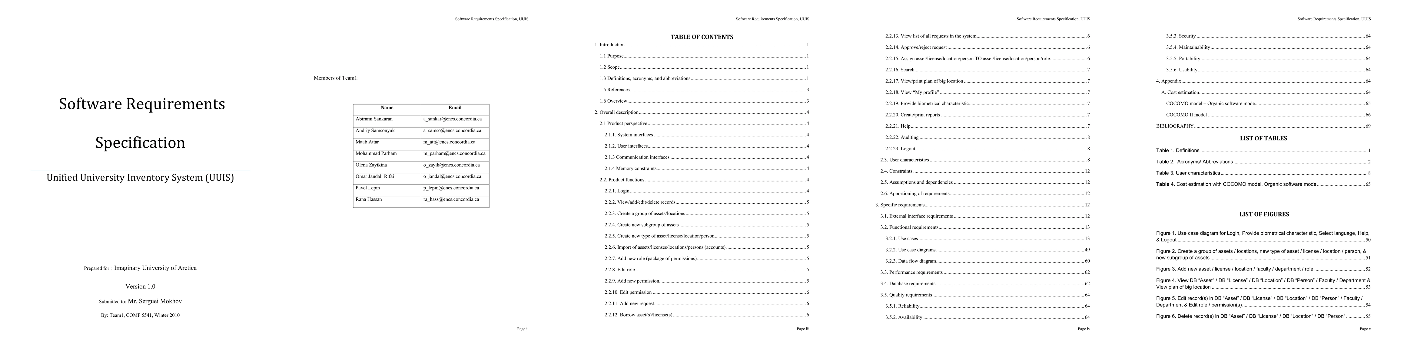 Unified University Inventory System (UUIS), is an inventory system created for the Imaginary University of Arctica (IUfA) to facilitate its inventory management, of all the faculties in one system. Team 1 elucidates the functions of the system and the characteristics of the users who have access to these functions. It shows the access restrictions to different functionalities of the system provided to users, who are the staff and students of the University. Team 1, also, emphasises on the necessary steps required to prevent the security of the system and its data.