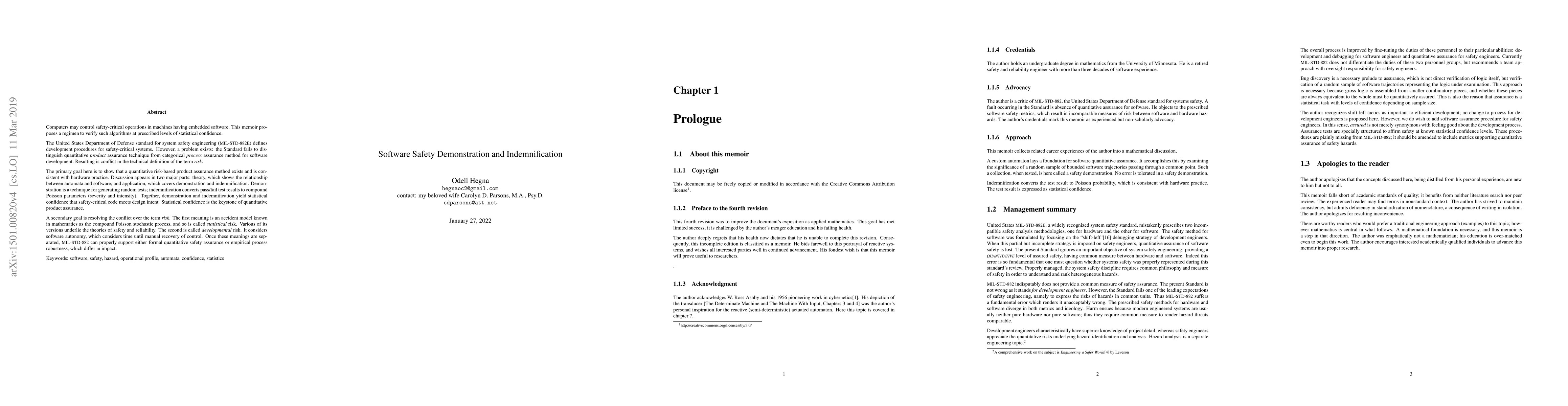 Computers may control safety-critical operations in machines having embedded software. This memoir proposes a regimen to verify such algorithms at prescribed levels of statistical confidence. The United States Department of Defense standard for system safety engineering (MIL-STD-882E) defines development procedures for safety-critical systems. However, a problem exists: the Standard fails to distinguish quantitative product assurance technique from categorical process assurance method for software development. Resulting is conflict in the technical definition of the term risk. The primary goal here is to show that a quantitative risk-based product assurance method exists and is consistent with hardware practice. Discussion appears in two major parts: theory, which shows the relationship between automata and software; and application, which covers demonstration and indemnification. Demonstration is a technique for generating random tests; indemnification converts pass/fail test results to compound Poisson parameters (severity and intensity). Together, demonstration and indemnification yield statistical confidence that safety-critical code meets design intent. Statistical confidence is the keystone of quantitative product assurance. A secondary goal is resolving the conflict over the term risk. The first meaning is an accident model known in mathematics as the compound Poisson stochastic process, and so is called statistical risk. Various of its versions underlie the theories of safety and reliability. The second is called developmental risk. It considers software autonomy, which considers time until manual recovery of control. Once these meanings are separated, MIL-STD-882 can properly support either formal quantitative safety assurance or empirical process robustness, which differ in impact.
