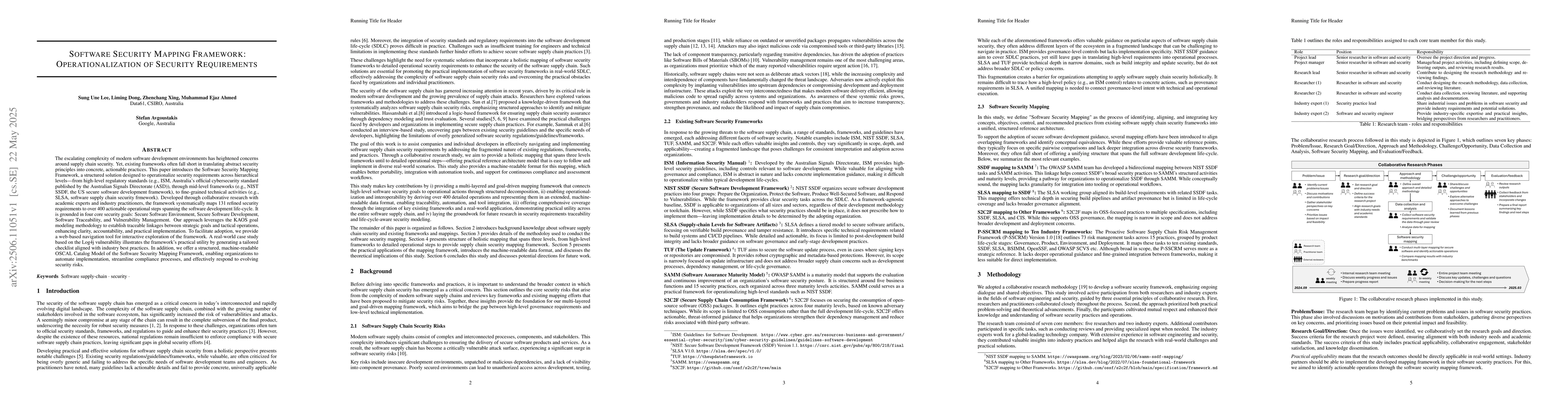 The Software Security Mapping Framework bridges the gap between abstract security principles and practical implementation, mapping 131 security requirements into 400 actionable steps across software development lifecycle stages. It's grounded in four core security goals and uses KAOS methodology for clear, accountable operations, aided by a web tool and machine-readable OSCAL Catalog Model for automated implementation and compliance.